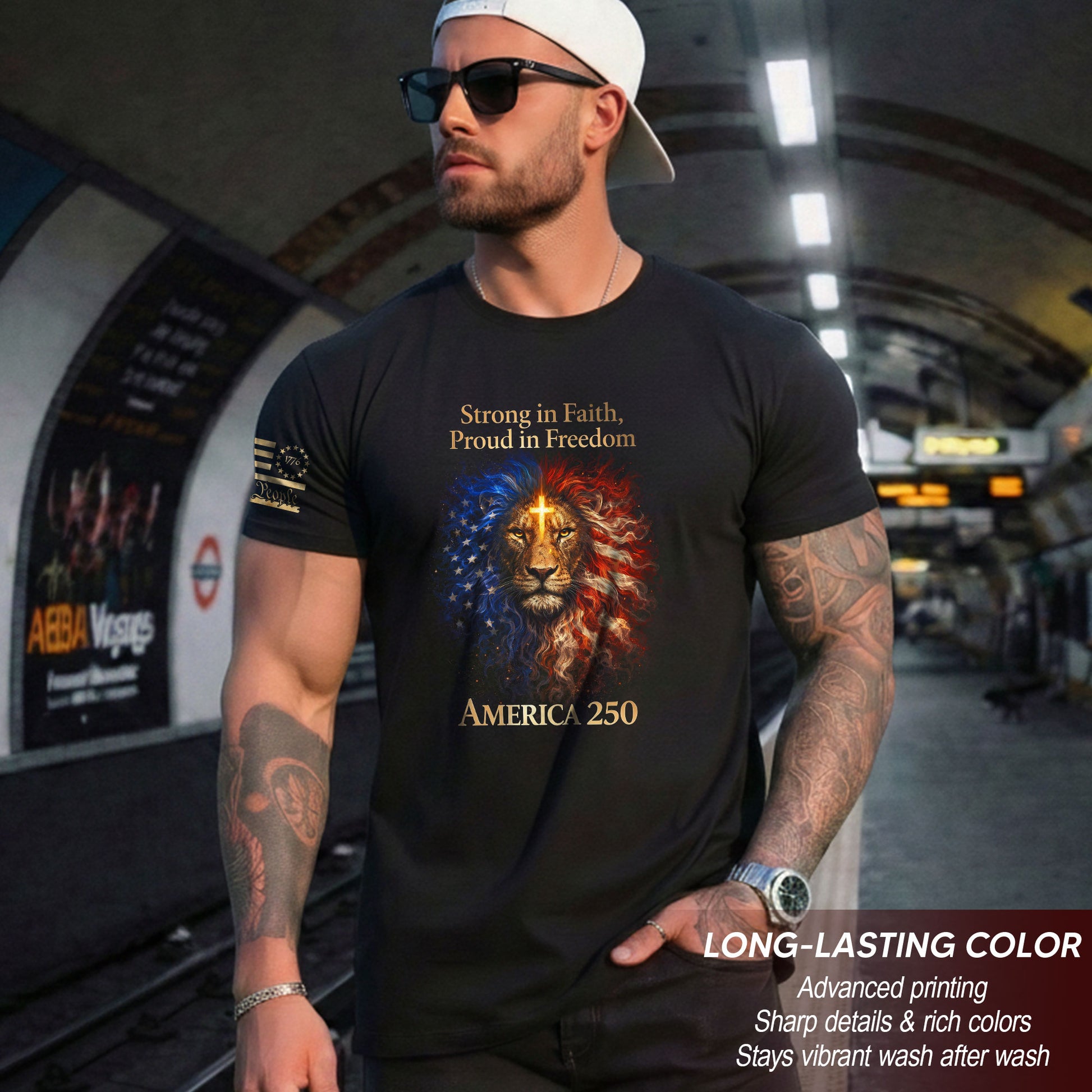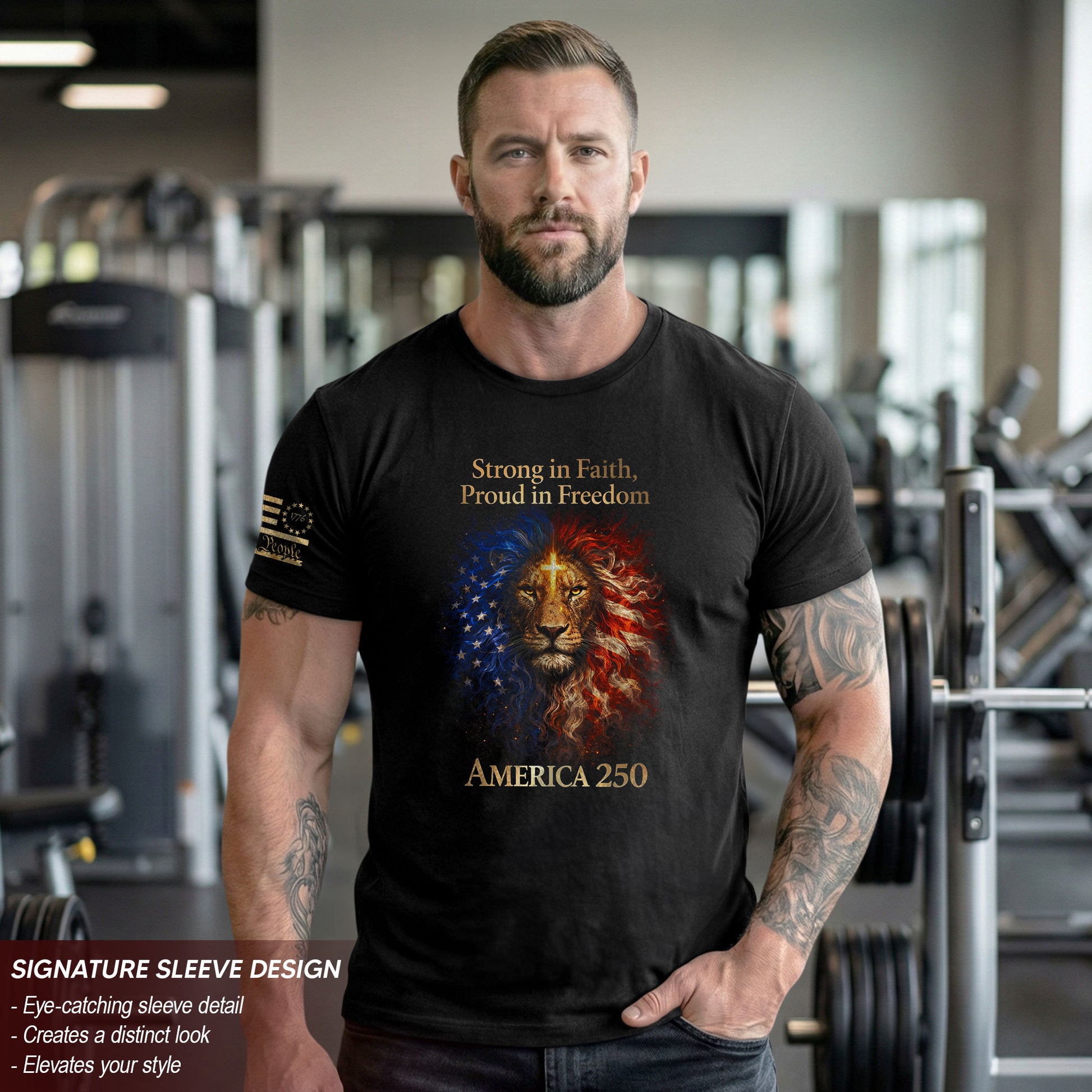 America 250th Anniversary 1776-2026 Semiquincentennial T-Shirt – Strong in Faith Proud in Freedom Lion Cross Patriotic Tee