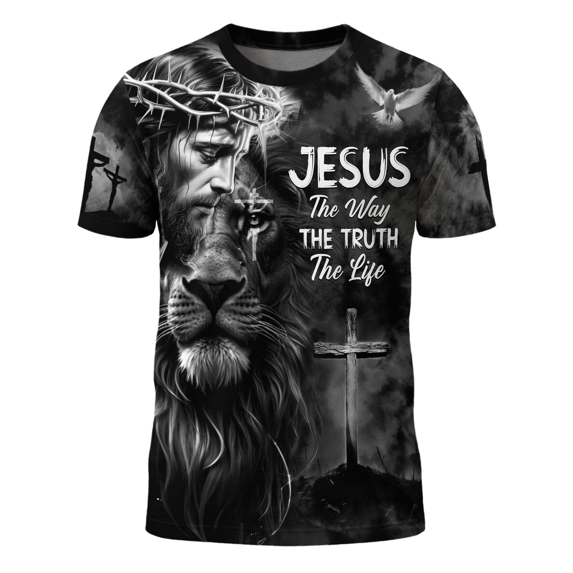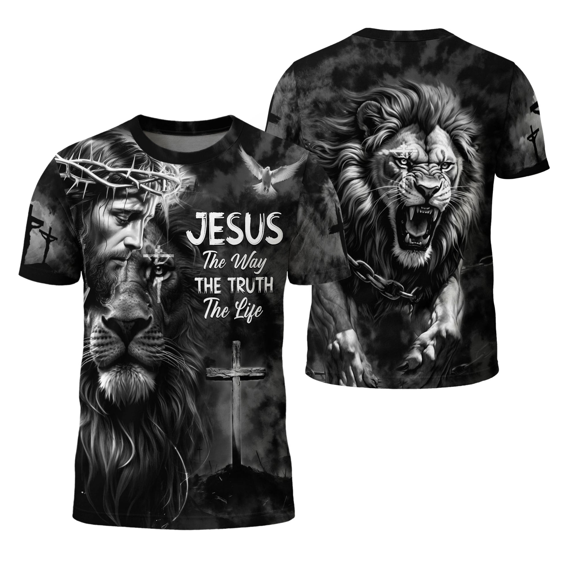 Striking Christian t-shirt featuring Jesus with a crown of thorns, roaring Lion of Judah, and the holy cross. The “The Way, The Truth, The Life” design celebrates strength, faith, and divine protection in every believer’s heart.