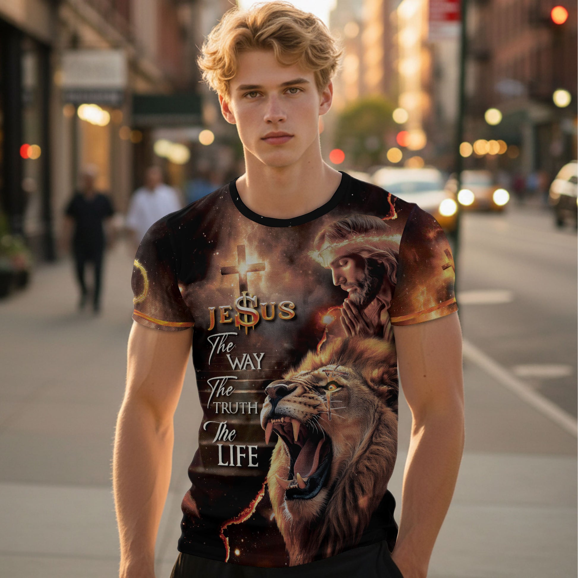This Christian T-shirt displays a fierce lion with glowing eyes beside Jesus crowned with thorns and a burning cross. The scripture “The Way, The Truth, The Life” from John 14:6 is boldly presented, symbolizing salvation and eternal faith. Designed with fiery cosmic details, this shirt is a striking expression of devotion and strength in Christ.