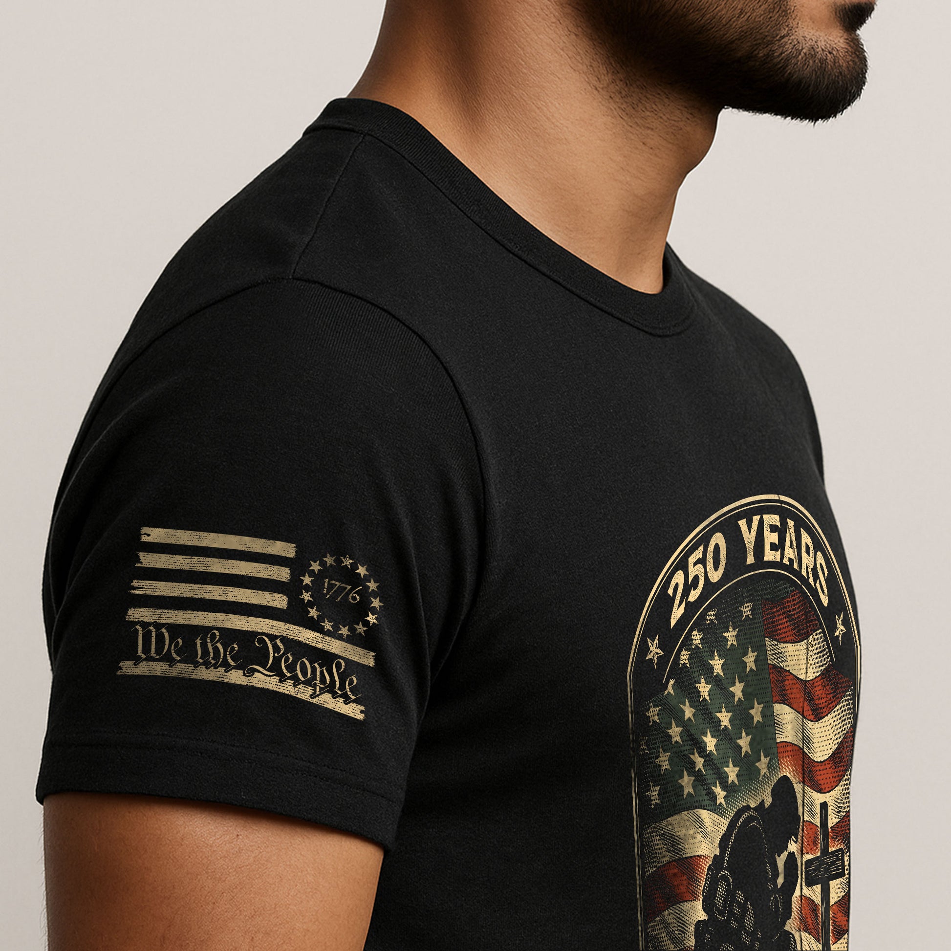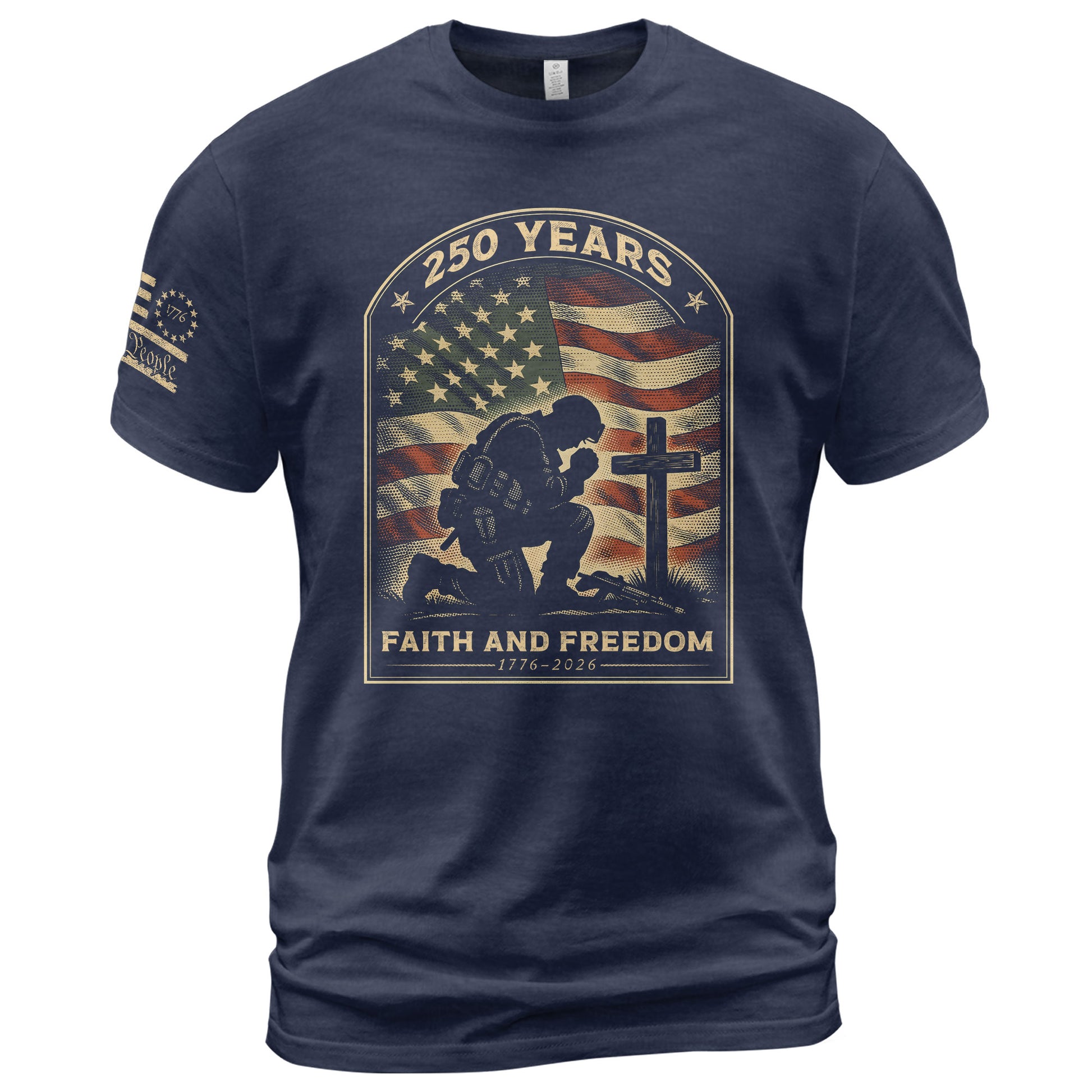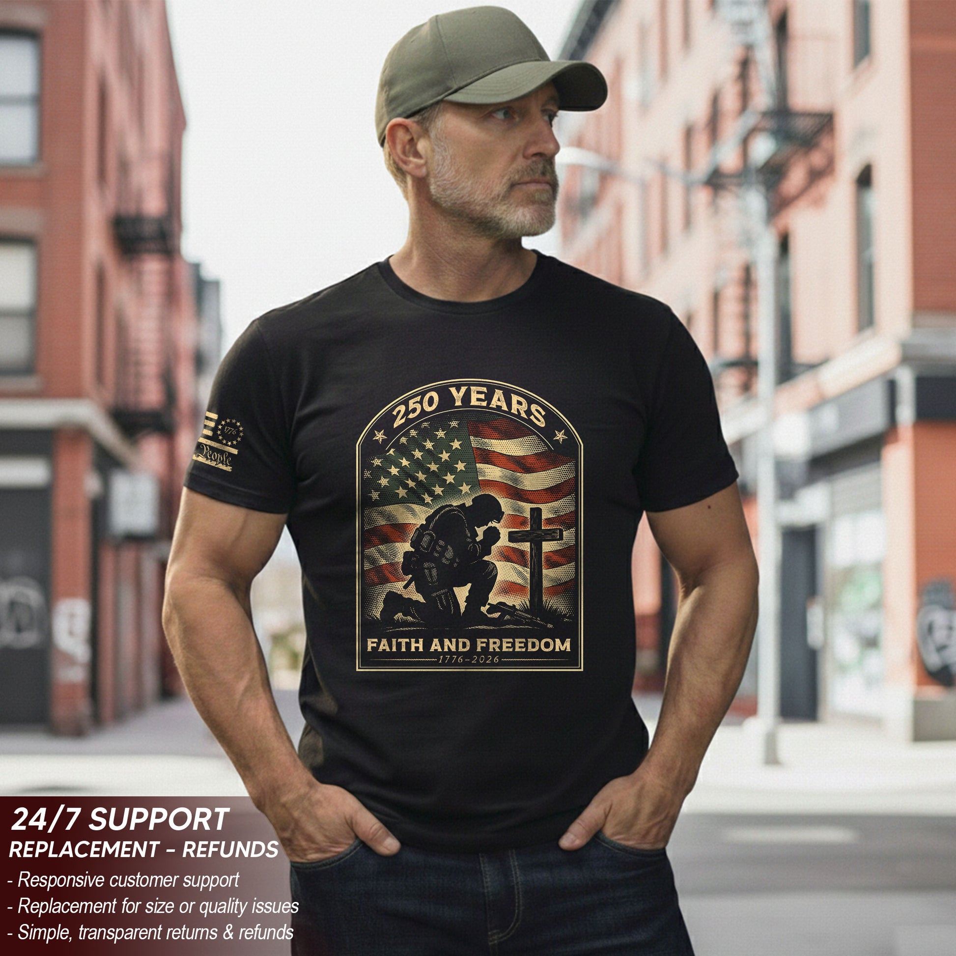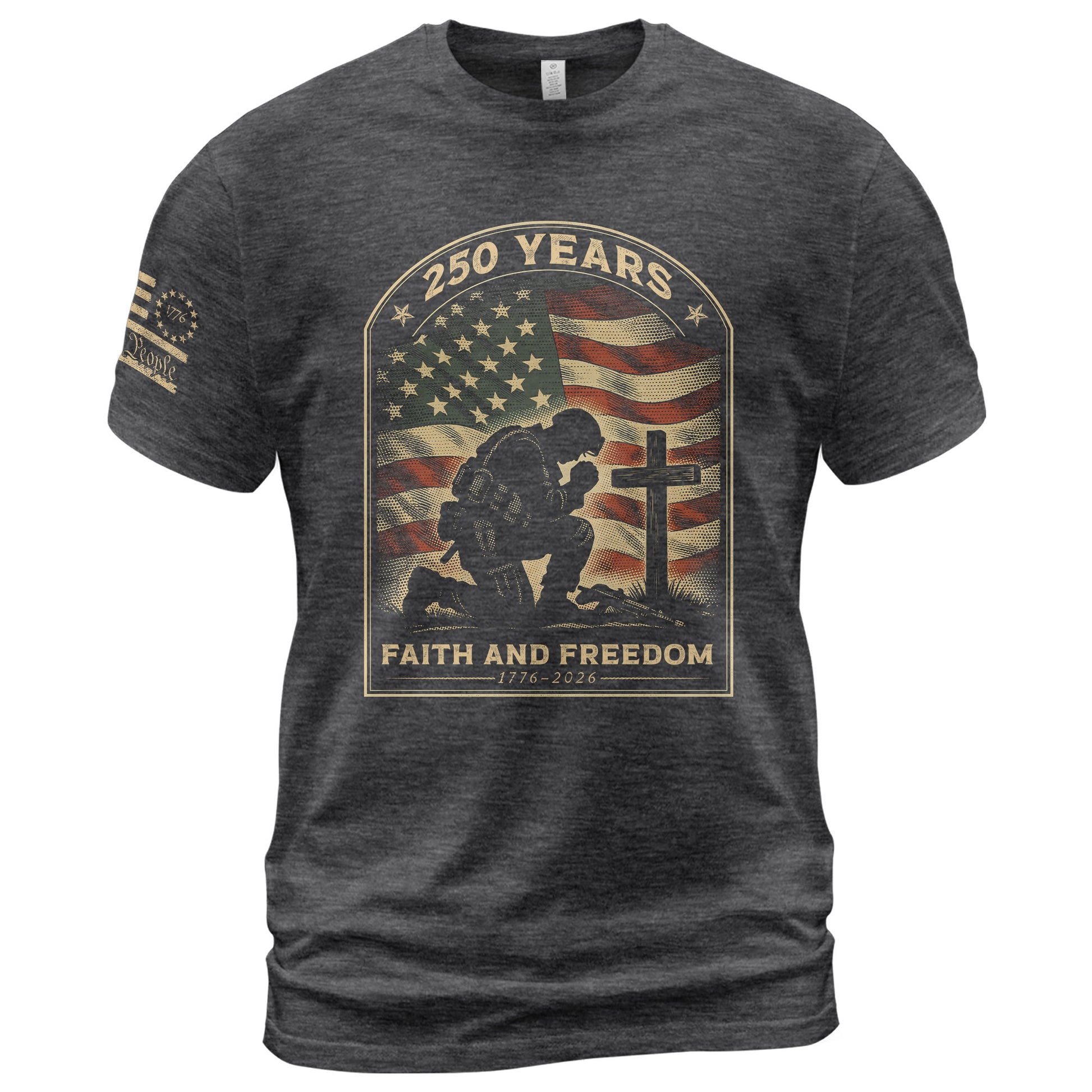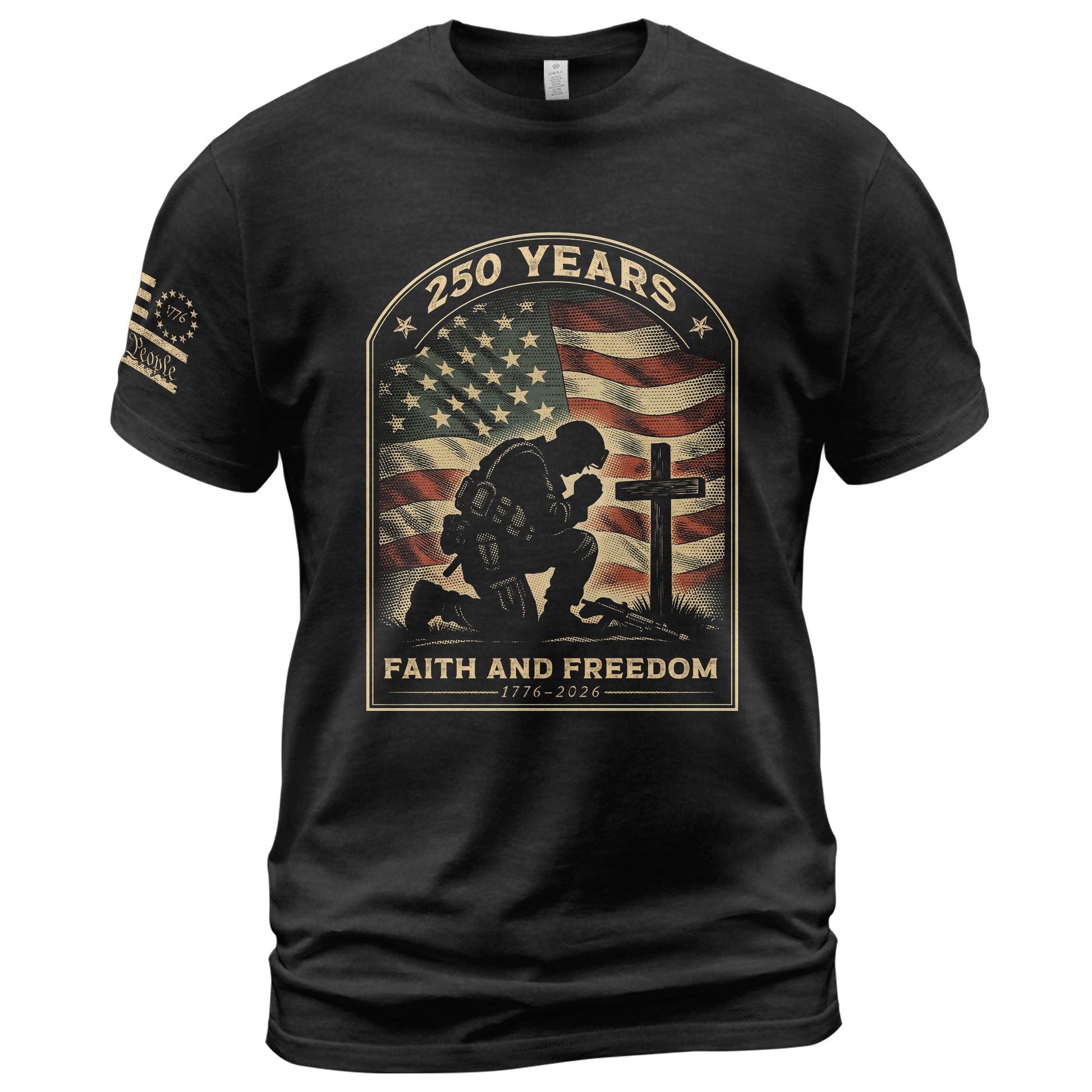 Faith and Freedom 250 Years 250th Anniversary Patriotic T-Shirt - Kneeling Soldier Prayer & American Flag Graphic Tee