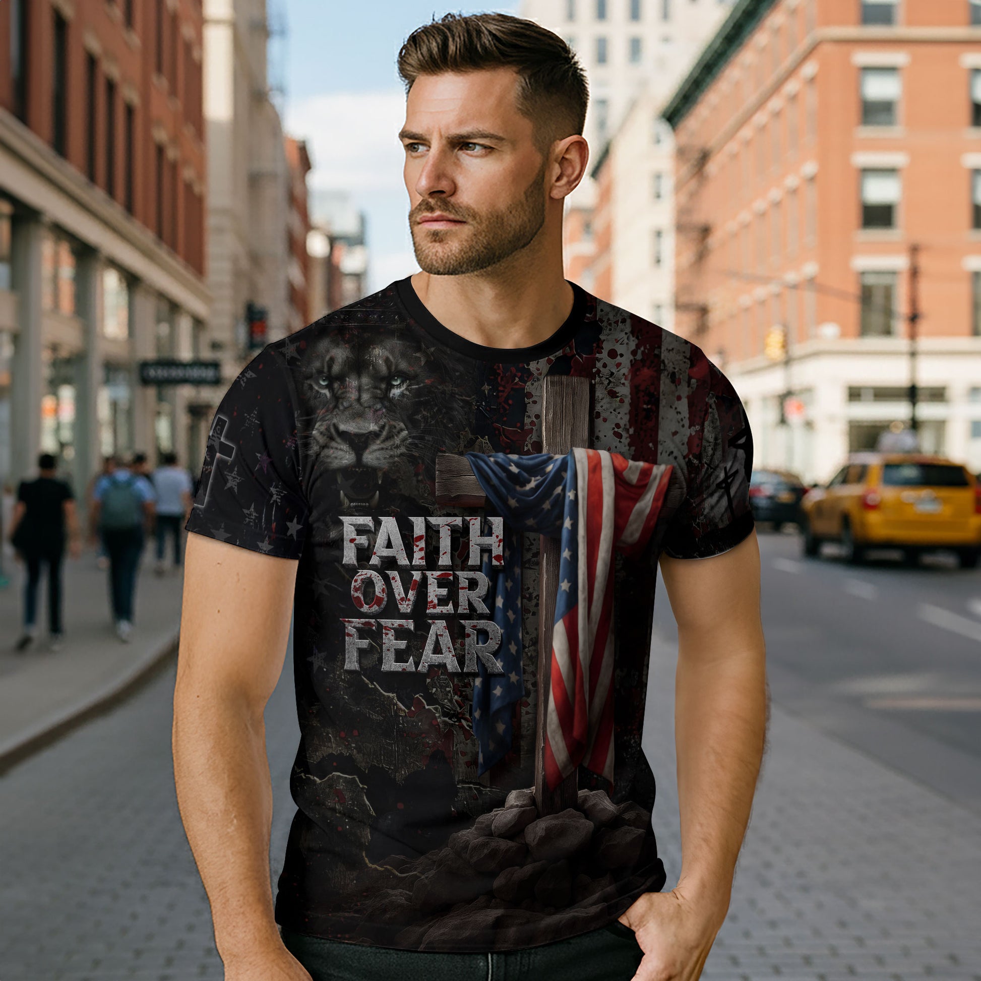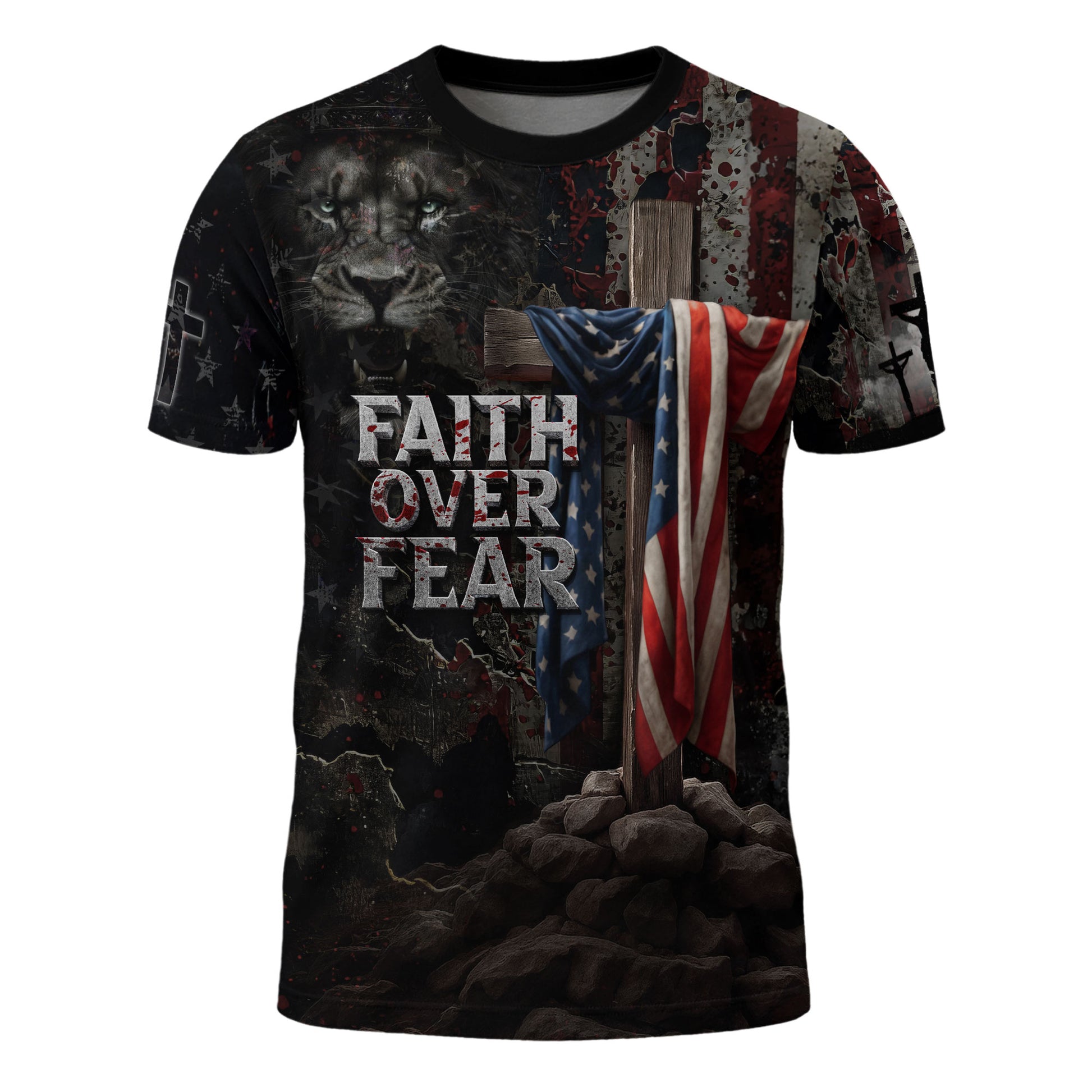 Faith Over Fear American Flag Cross Jesus Lion Of Judah Christian Patriotic T-Shirt