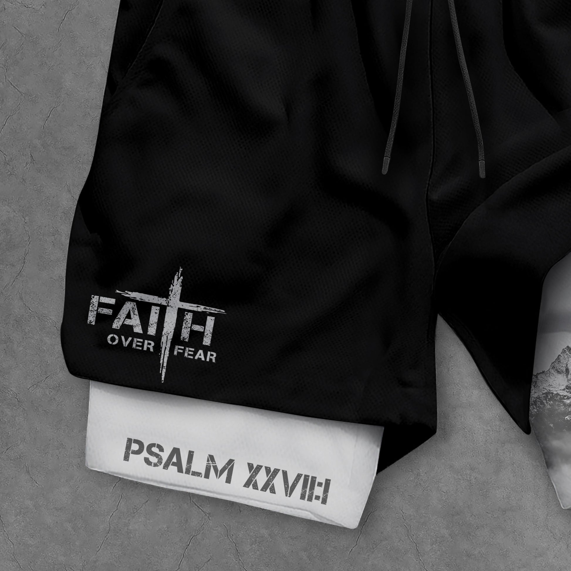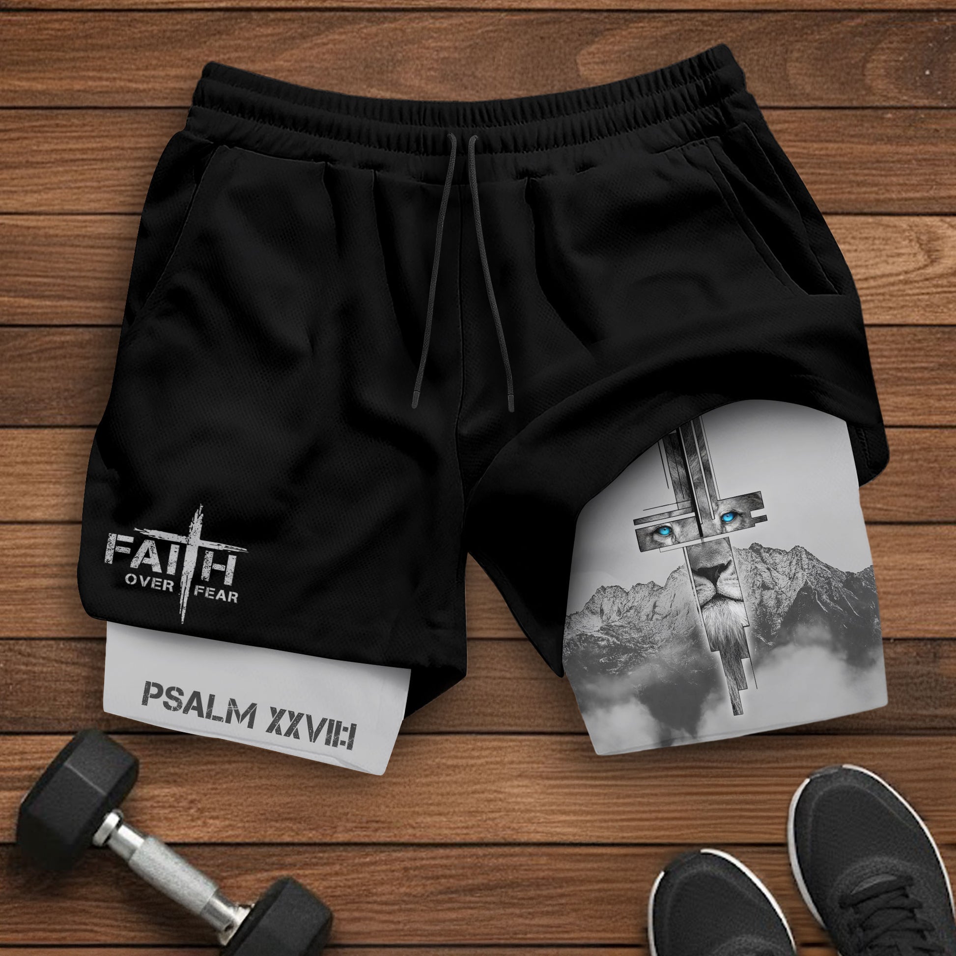Faith Over Fear Christian Gym Shorts for Men Lion Cross Design
