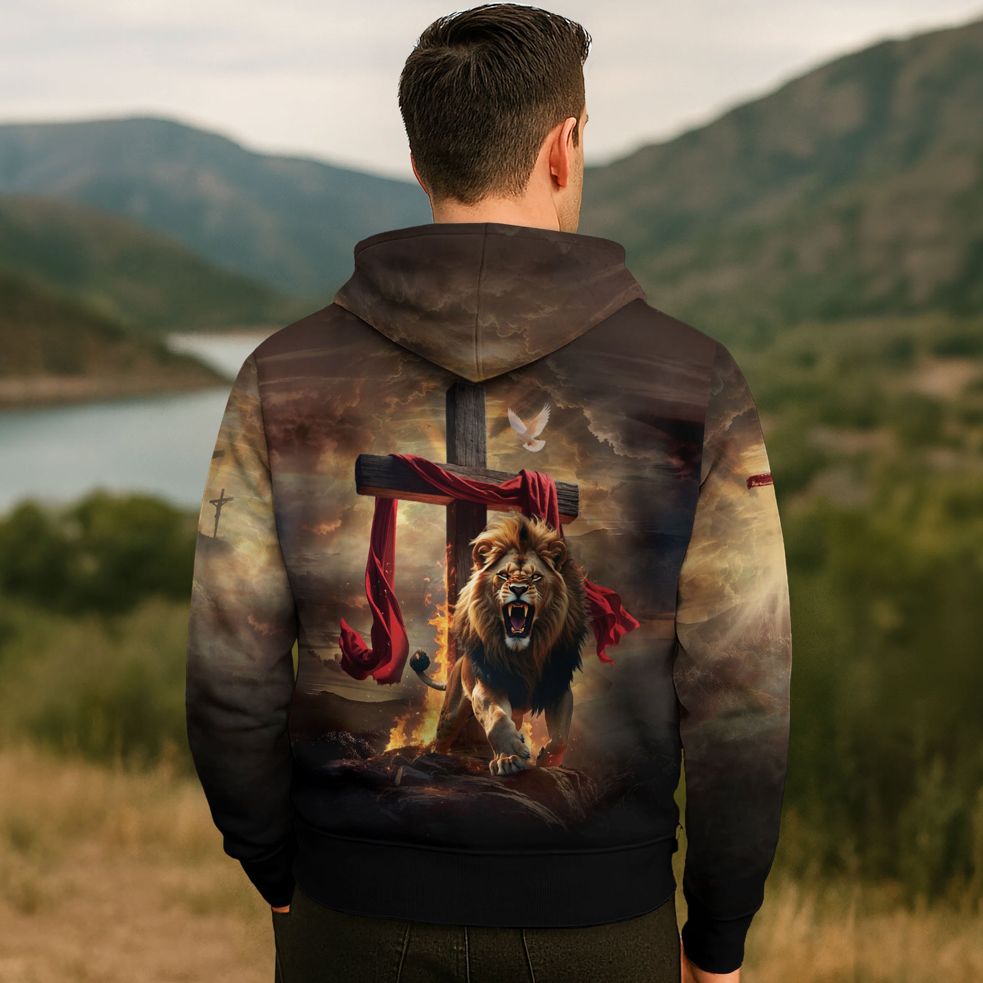 Powerful Christian Hoodie featuring a lion, lamb, and cross with red cloth under a radiant sky. A bold “Faith Over Fear” design symbolizing strength and faith in Christ.