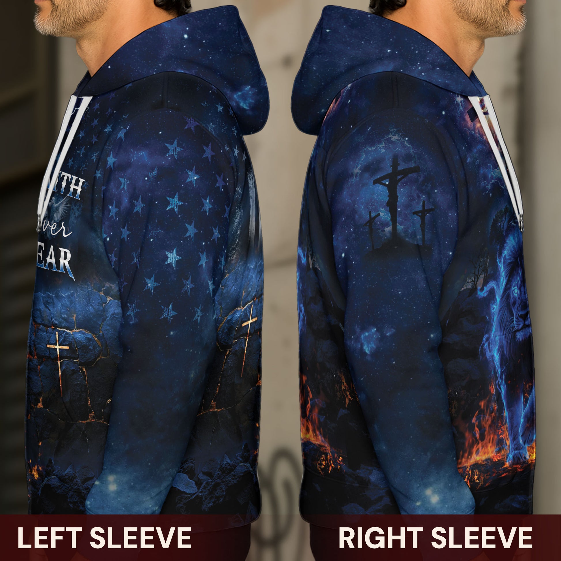 Faith Over Fear Christian Hoodie Lion Cross Blue Lightning Design