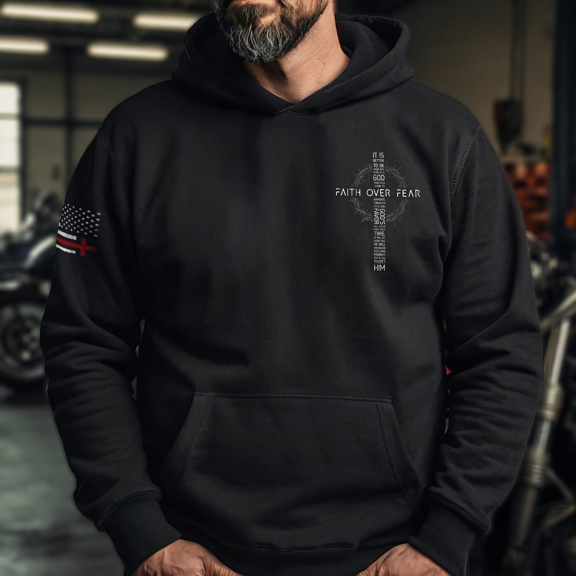 Faith Over Fear Christian Hoodie Patriotic American Flag Cross Design