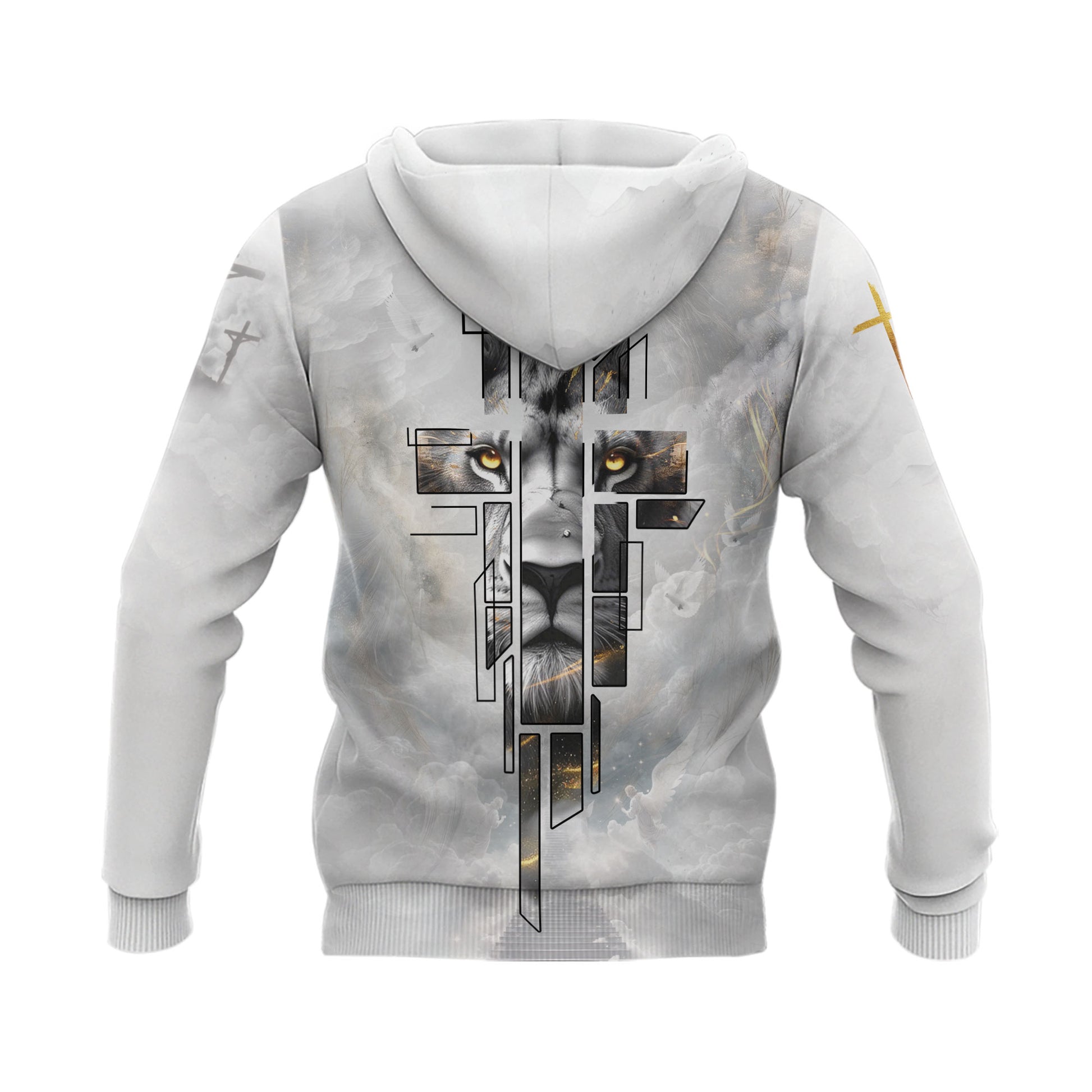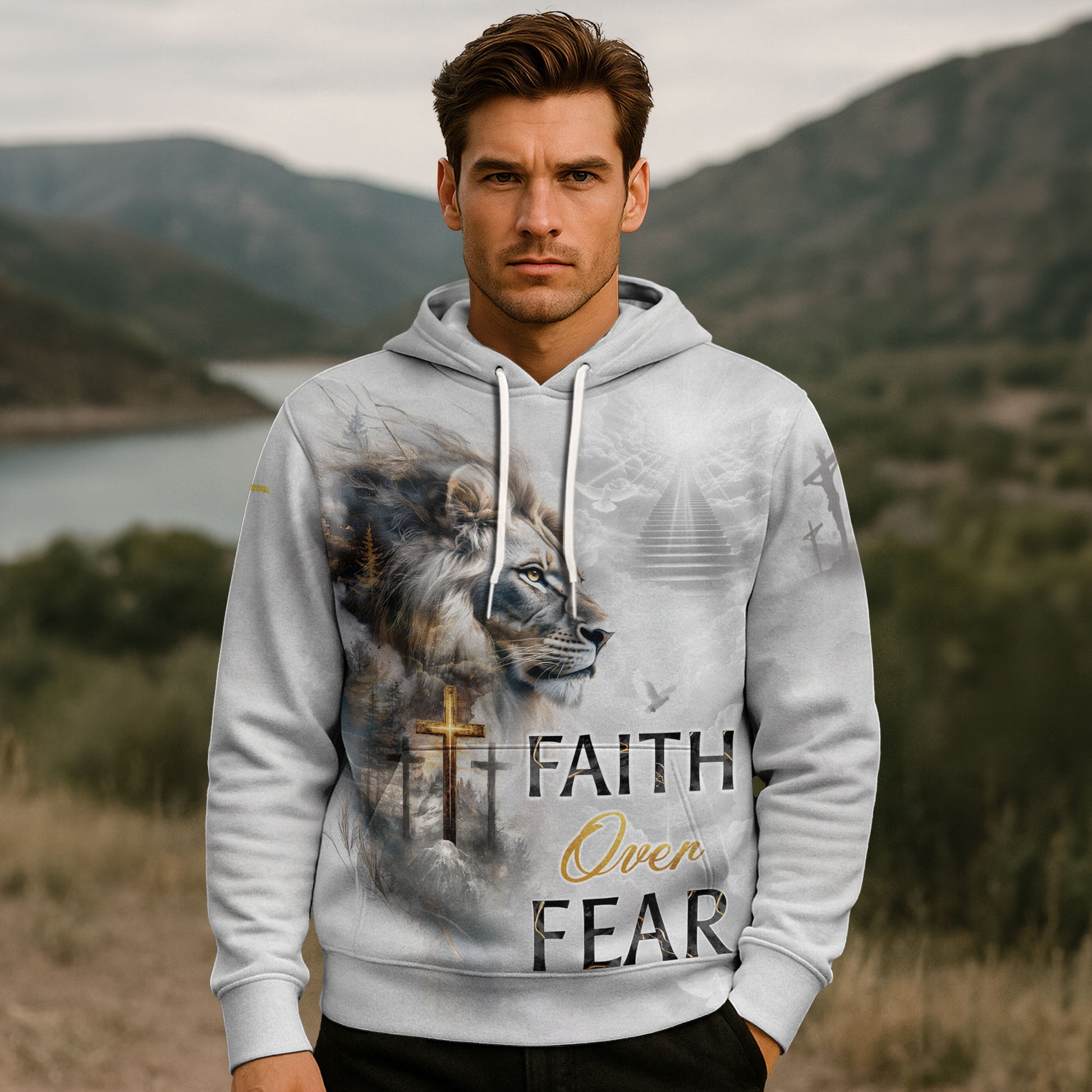 Faith Over Fear Christian Hoodie White Lion Cross Heaven Design