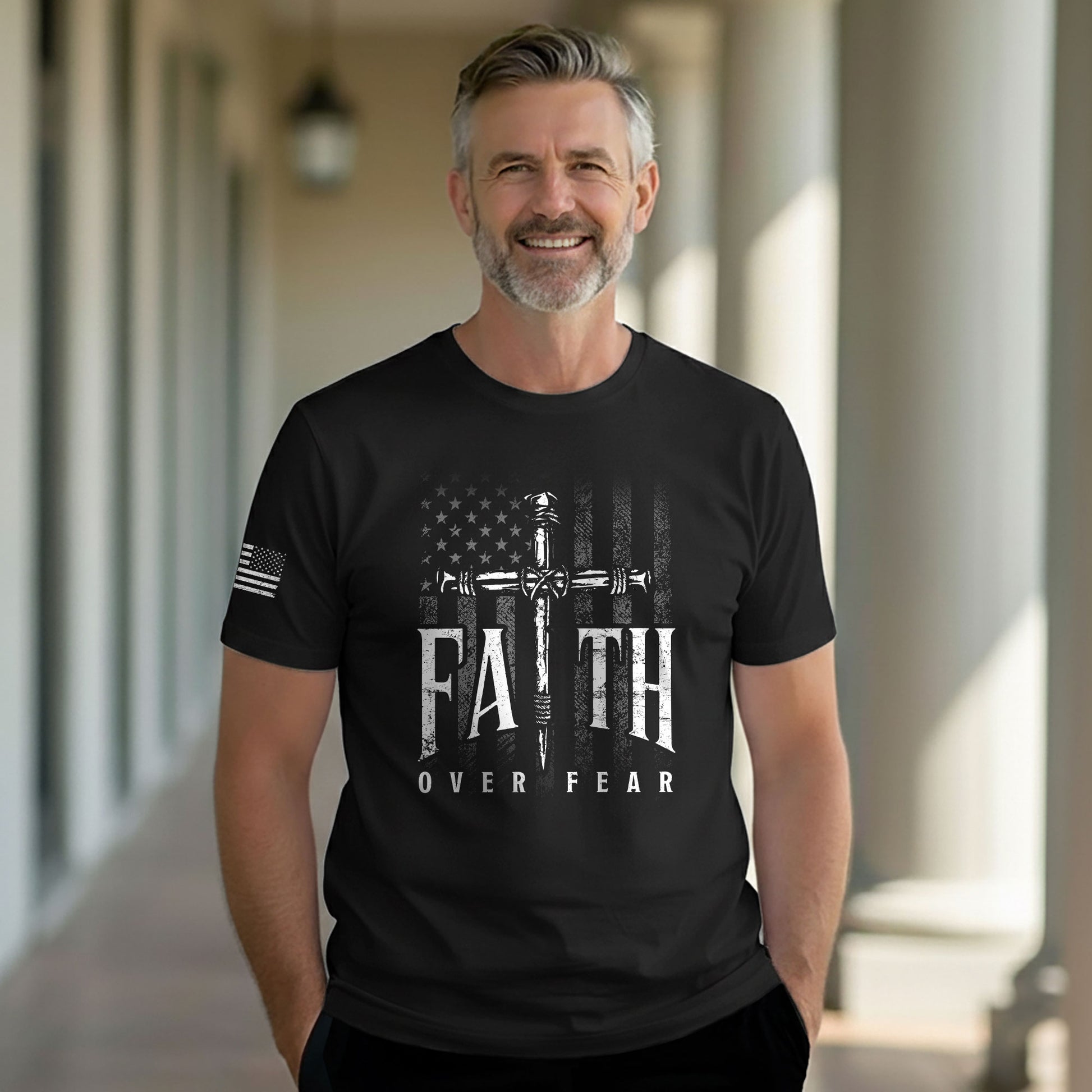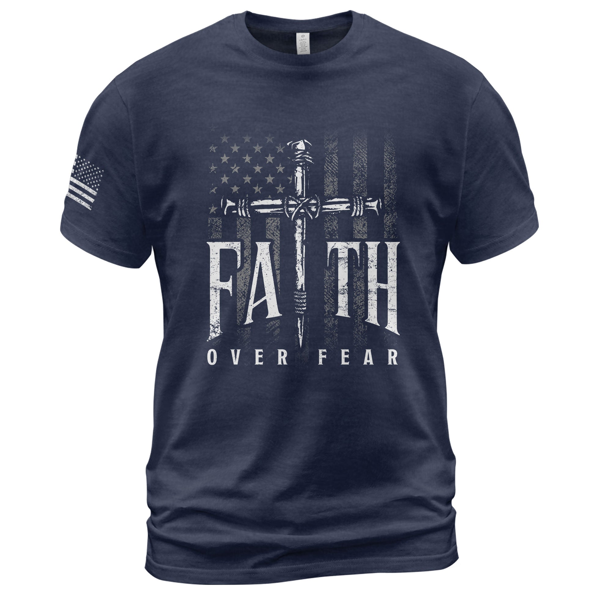 Christian T-Shirt with American flag and cross sword design featuring Faith Over Fear message. Bold look representing courage, faith, and strength in God.