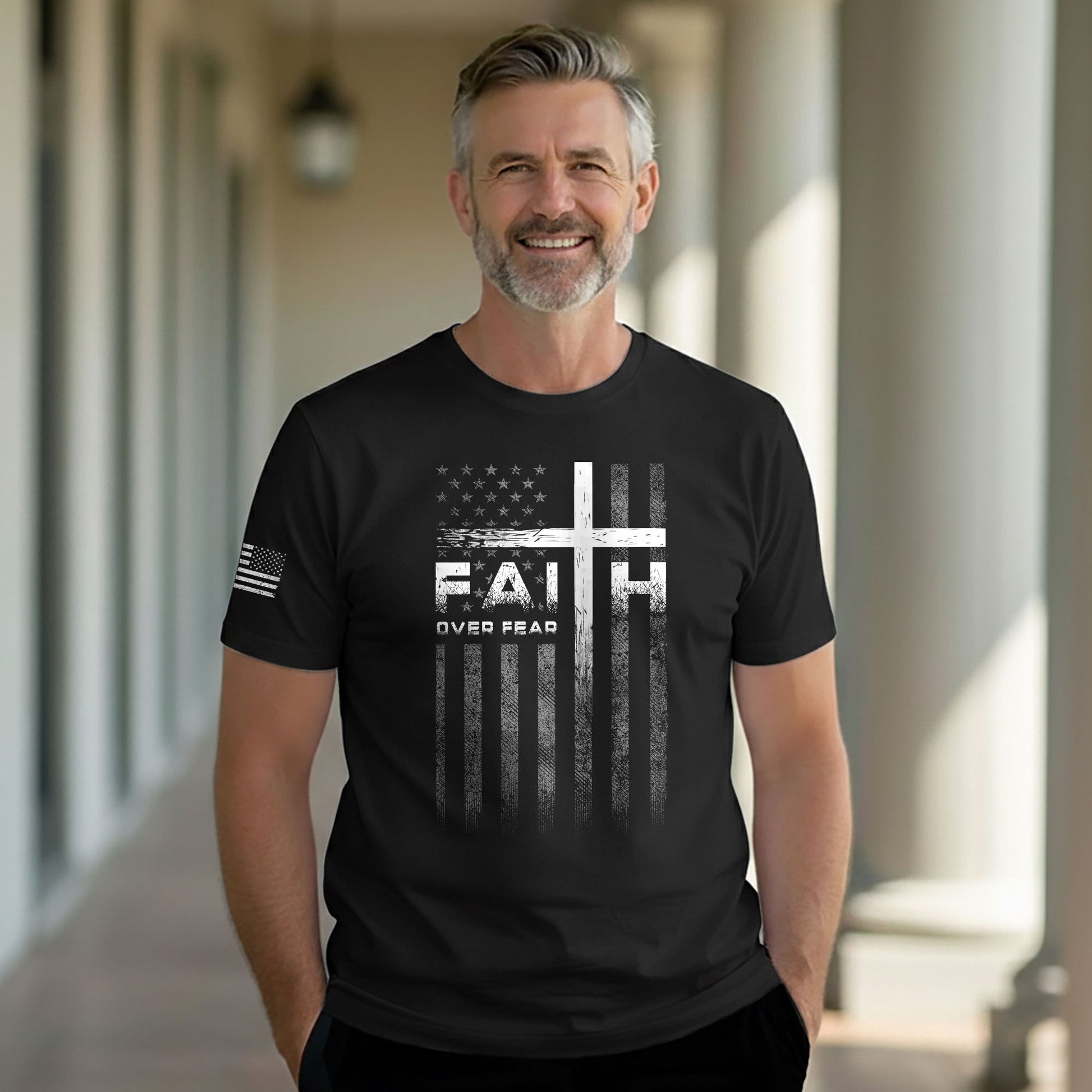 Christian T-Shirt featuring a cross and American flag design with Faith Over Fear message. Simple yet bold look symbolizing faith, courage, and patriotism.