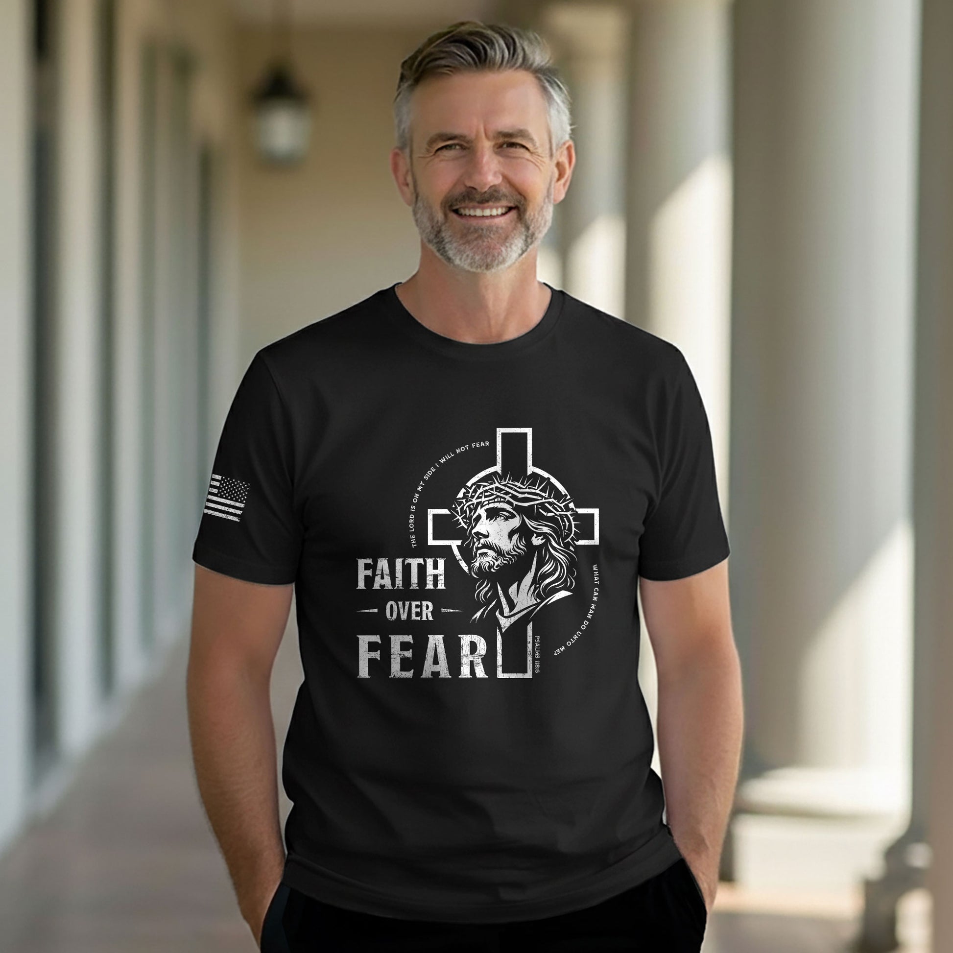 Christian T-Shirt featuring Jesus with crown of thorns and Faith Over Fear message. Bold cross design symbolizes strength, hope, and unshakable faith in Christ.