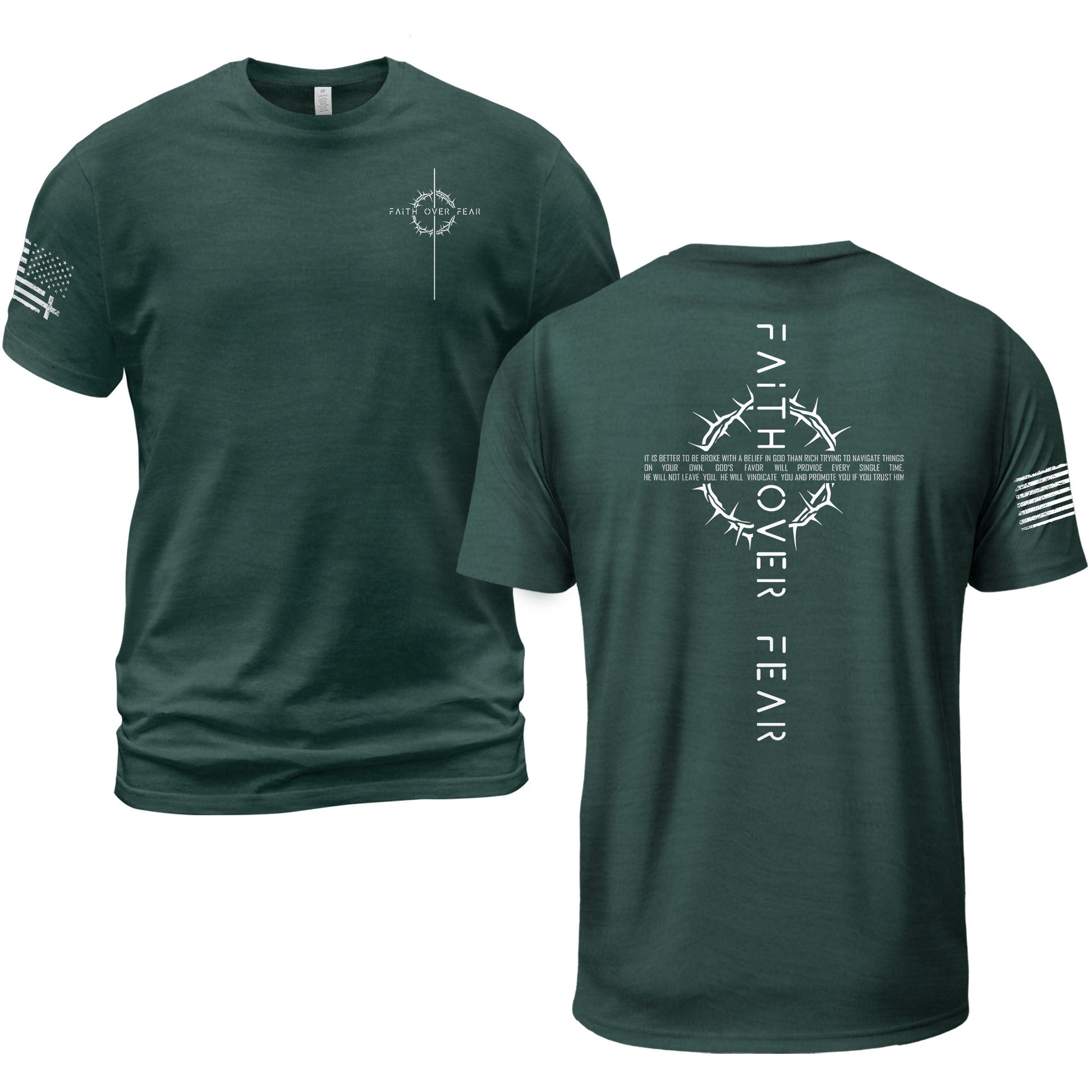 A Christian T-Shirt with Faith Over Fear design and crown of thorns cross. A bold expression of faith and a daily reminder to trust God over fear.