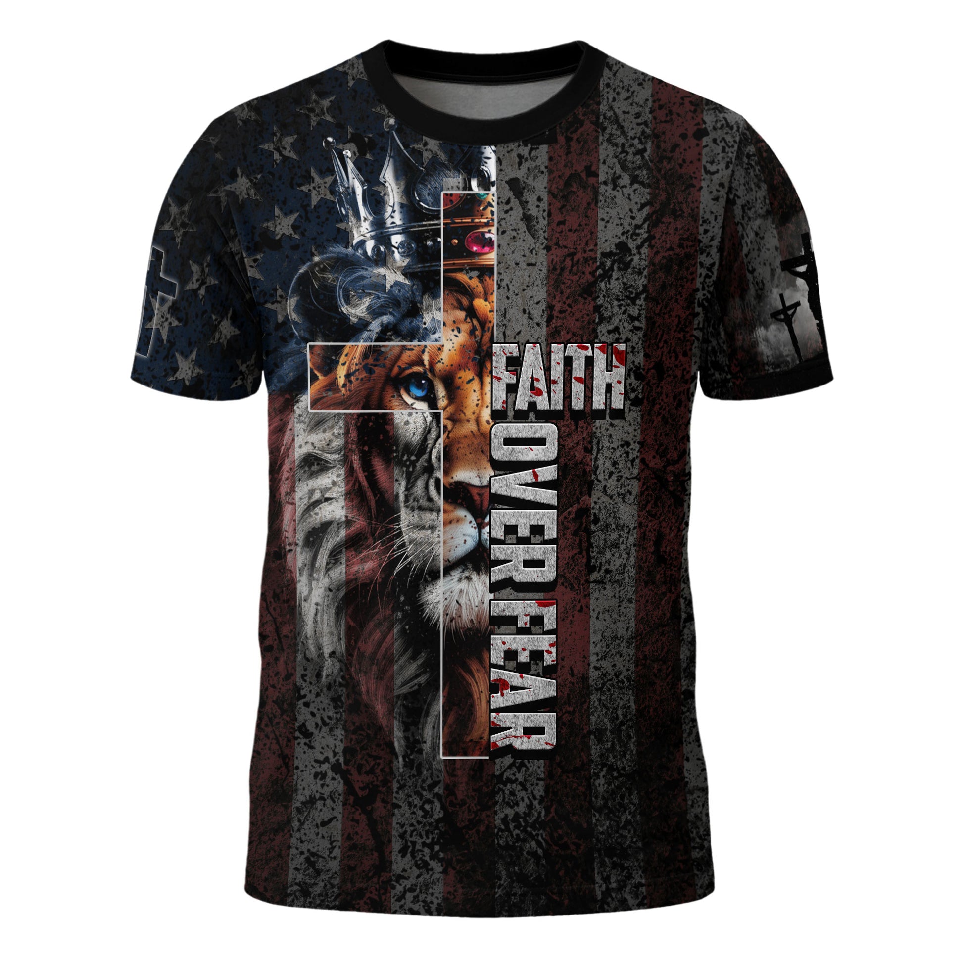 Faith Over Fear Jesus Crown Lion Of Judah American Flag Christian Warrior T-Shirt