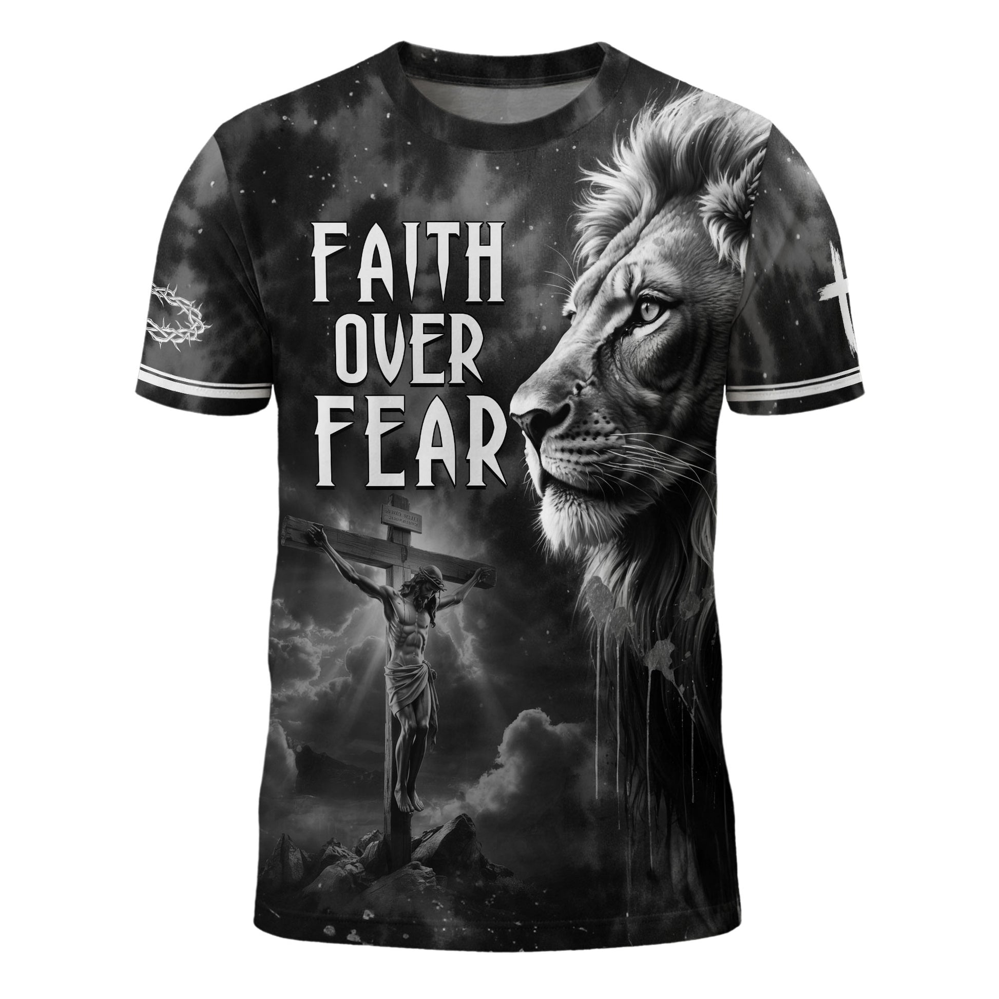 Powerful black and white Christian design featuring Jesus on the cross and the Lion of Judah united in strength and faith. A bold reminder to choose faith over fear, perfect for devoted believers and spiritual warriors.