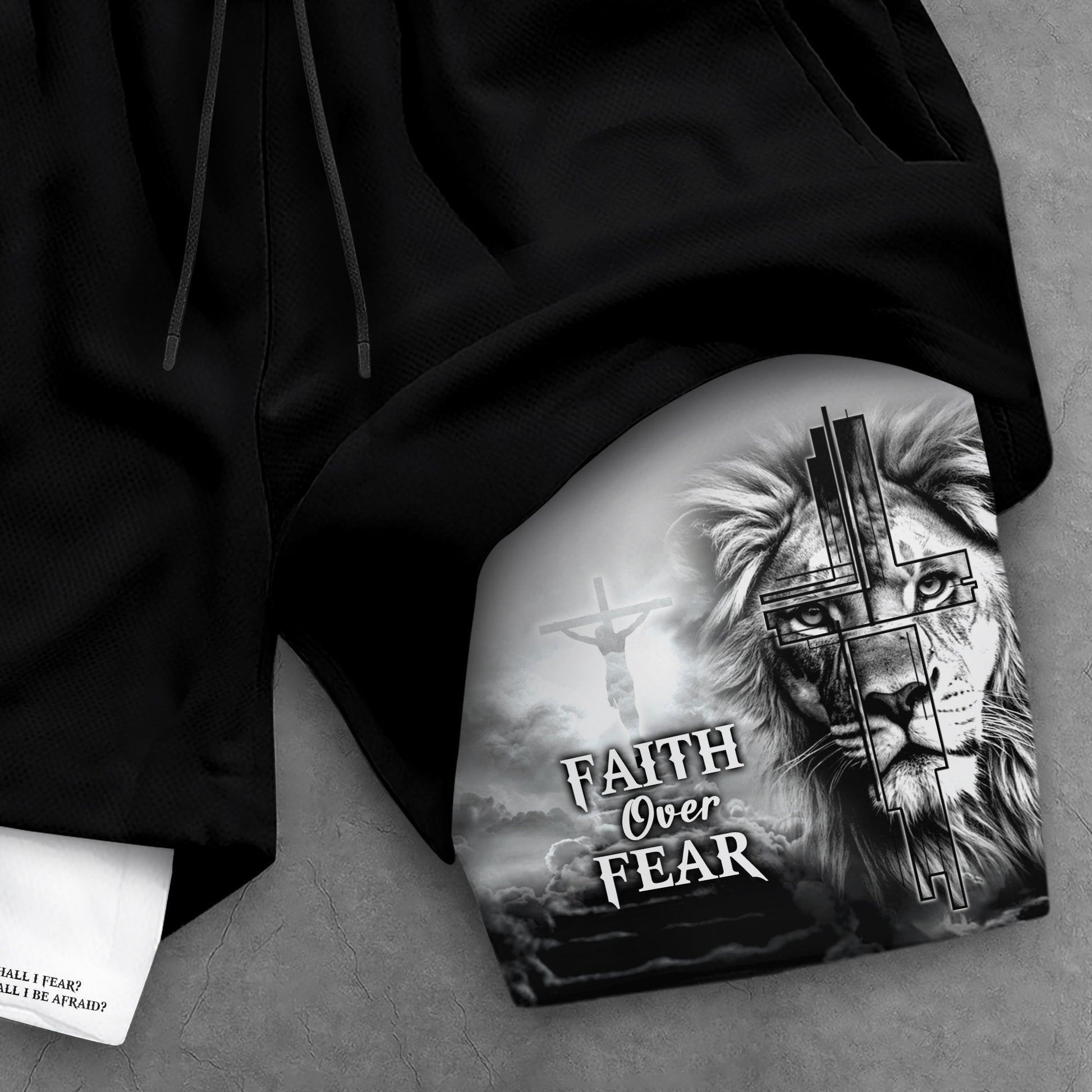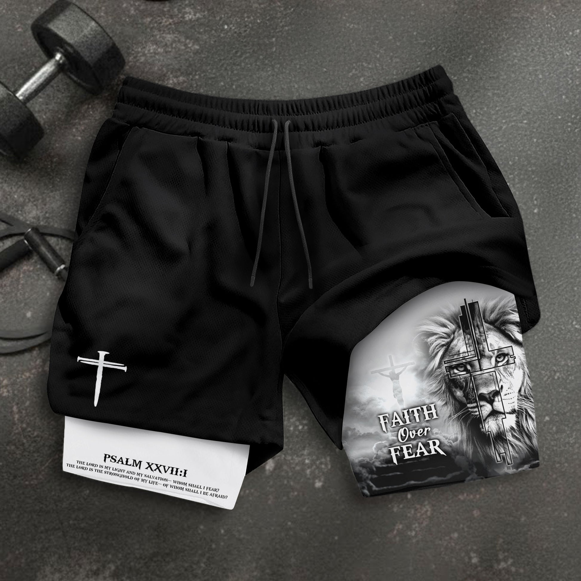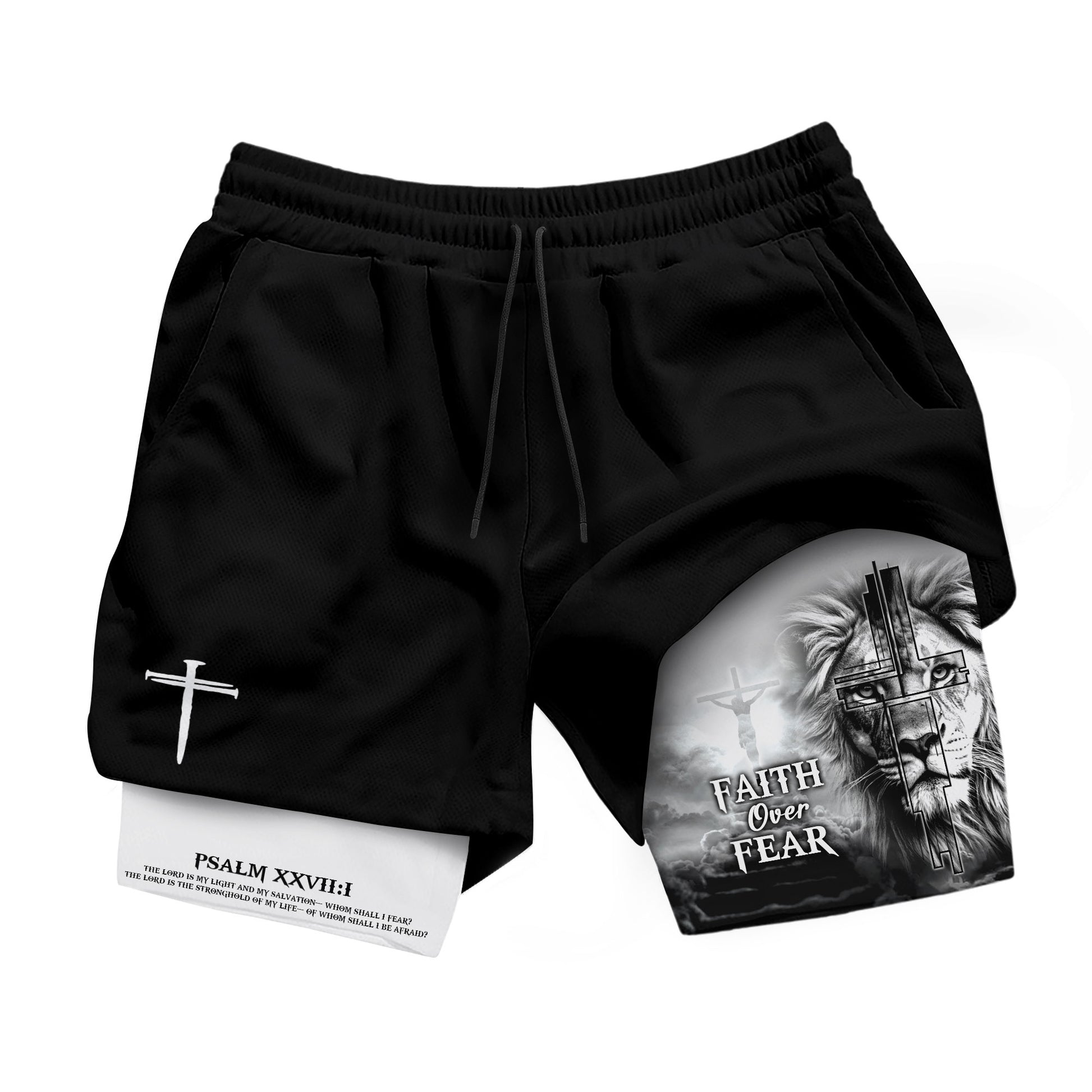 Faith Over Fear Christian shorts with Psalm 27 1 Lion Cross design. Built for strength, courage, and unwavering belief in God.
