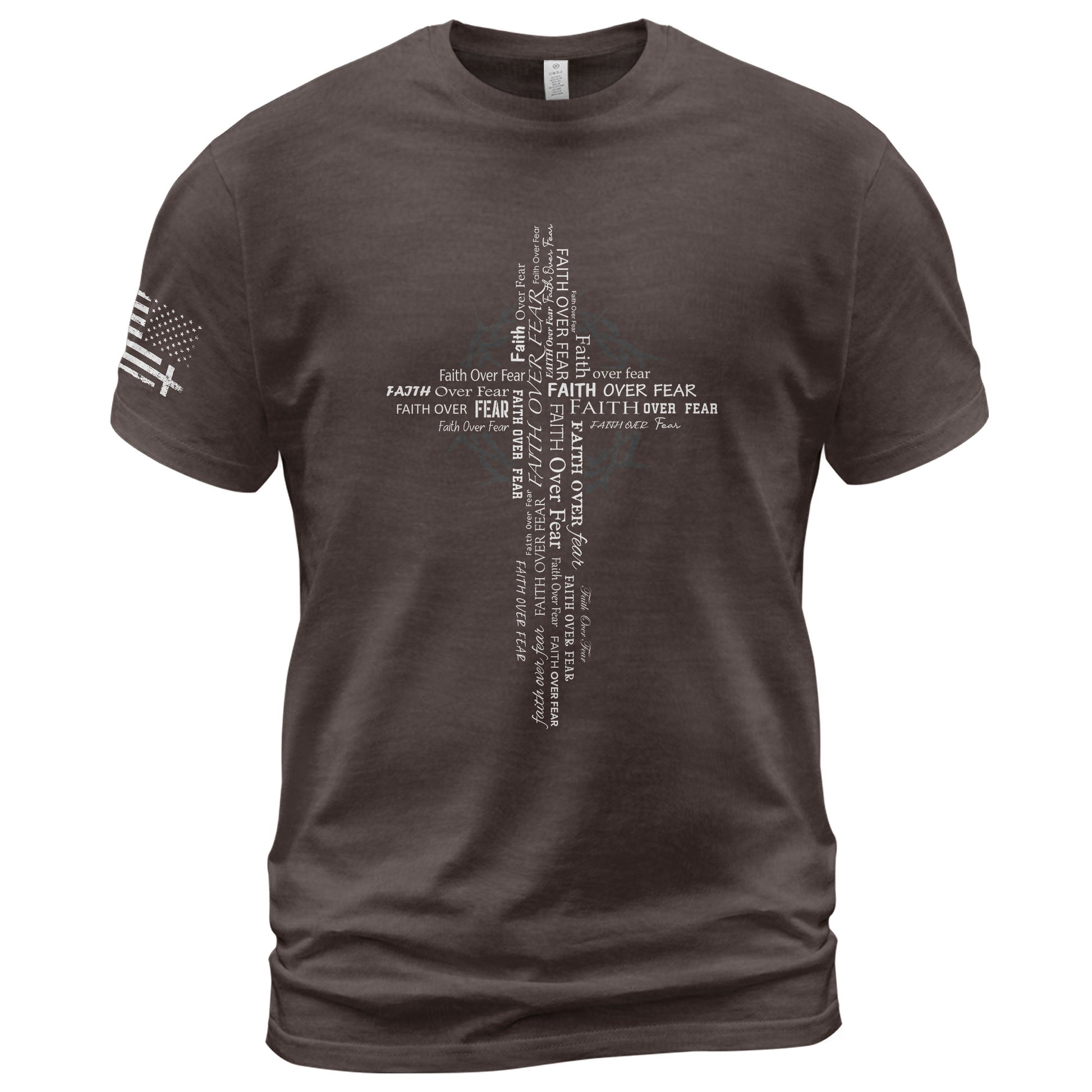 Unique Christian t-shirt featuring a creative cross design formed entirely from the words “Faith Over Fear,” layered over a subtle crown of thorns graphic. A modern expression of courage and devotion, perfect for believers who love artistic faith-inspired fashion.
