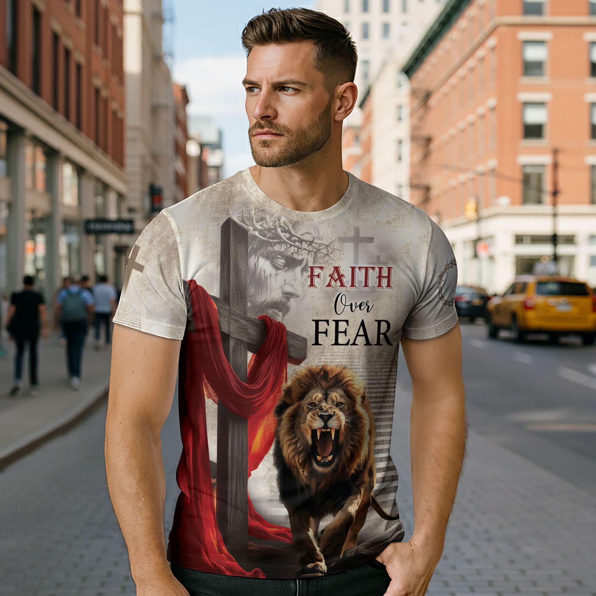 Featuring a classic round neck, short sleeves, and full all-over print design with bold Christian messages. Crafted from premium polyester for a soft, breathable, and durable wear that keeps you comfortable all day!