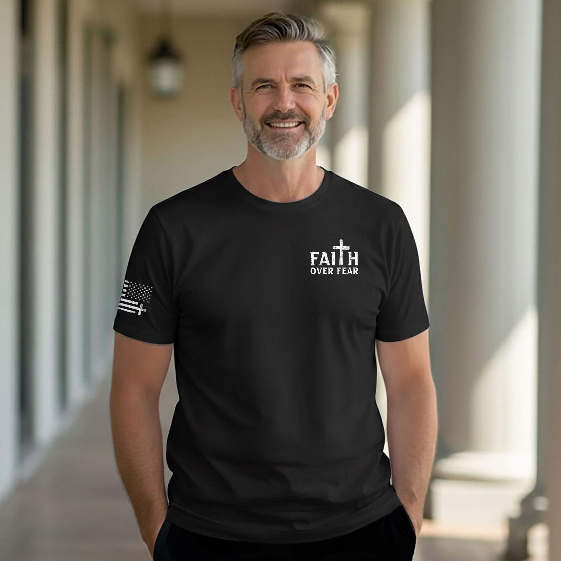A bold Christian T-Shirt featuring Faith Over Fear message with wooden cross and crown of thorns. A powerful reminder to trust God above all fear.