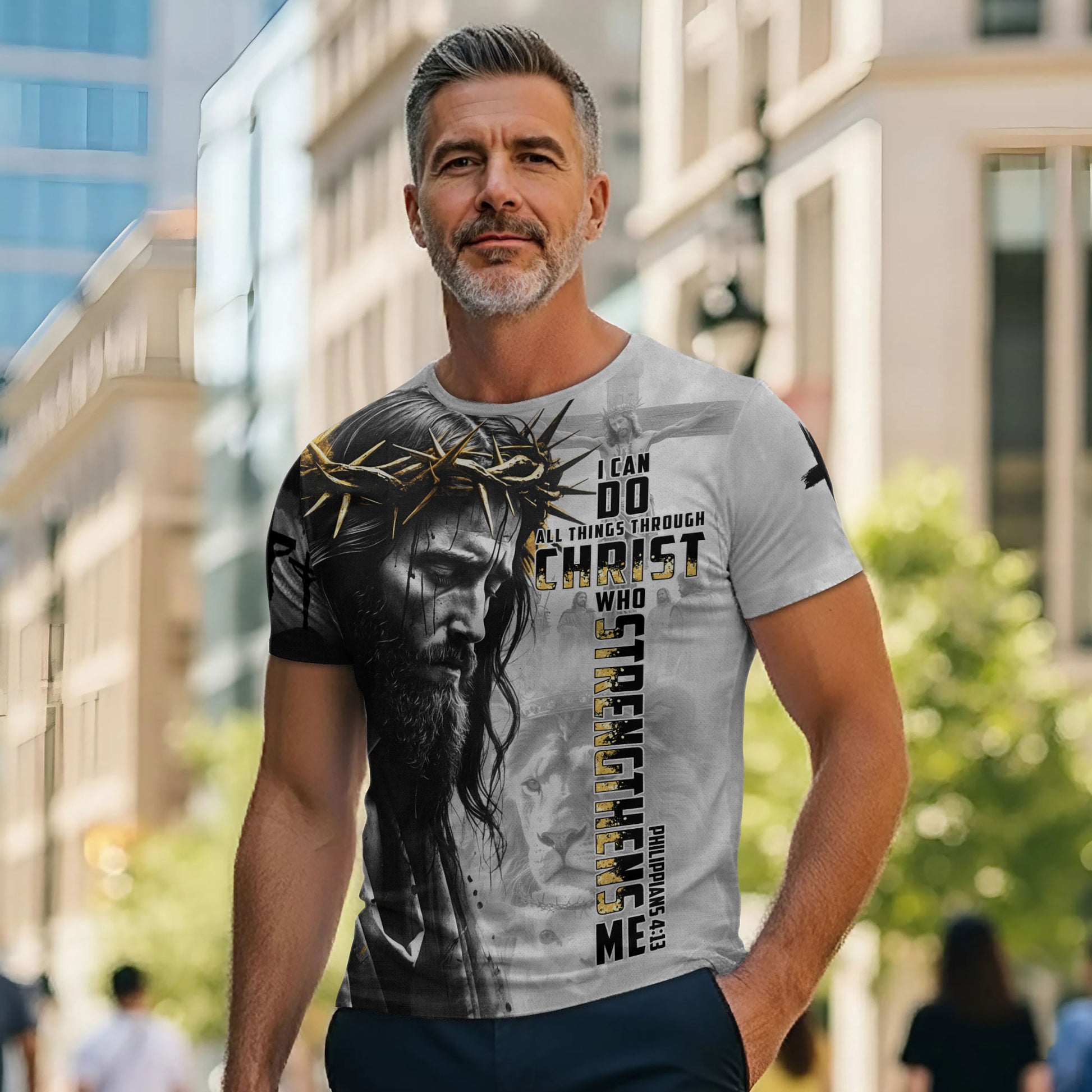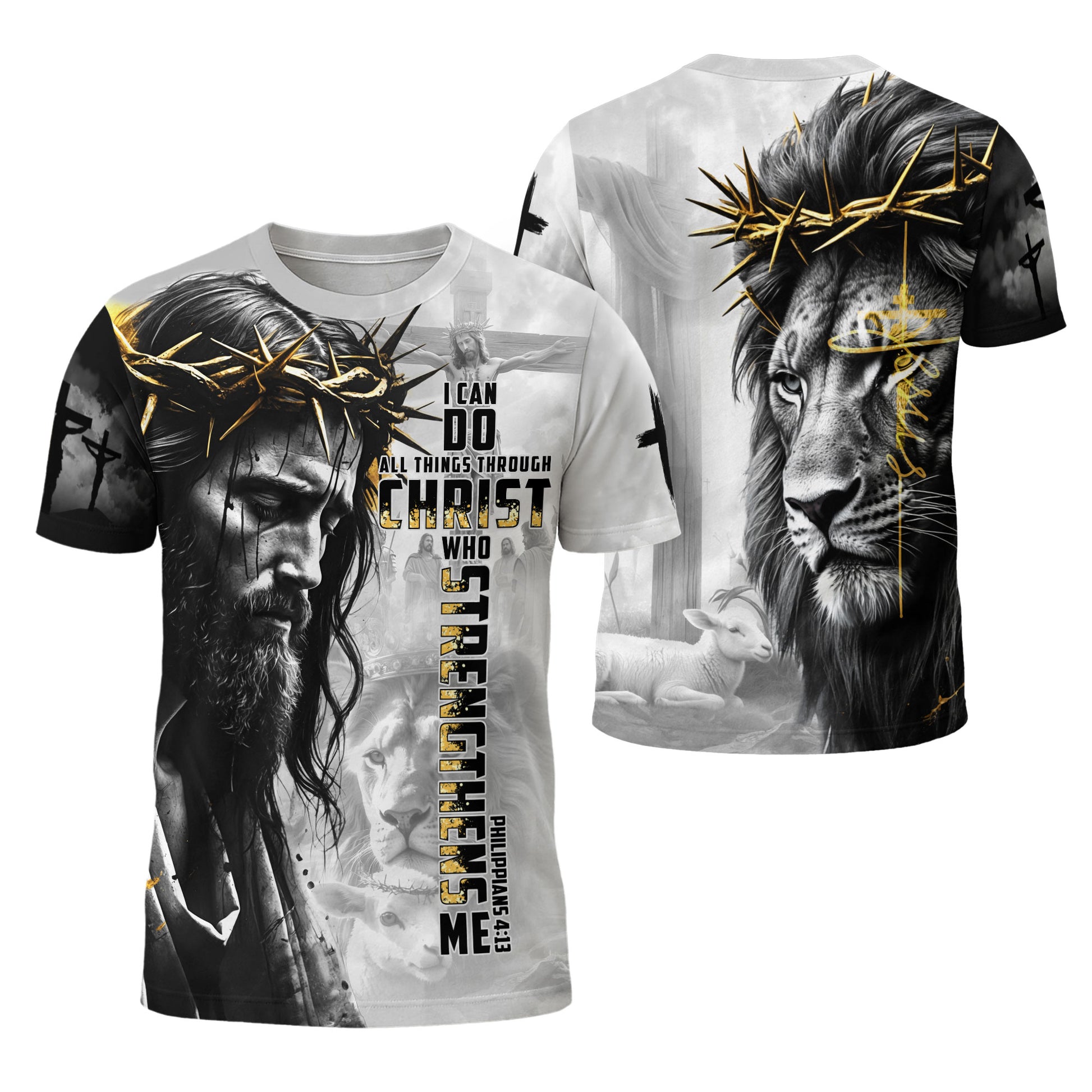 Bold Christian T-Shirt featuring Jesus with a crown of thorns and the Lion of Judah — inspired by Philippians 4:13, reminding believers that true strength comes from Christ.