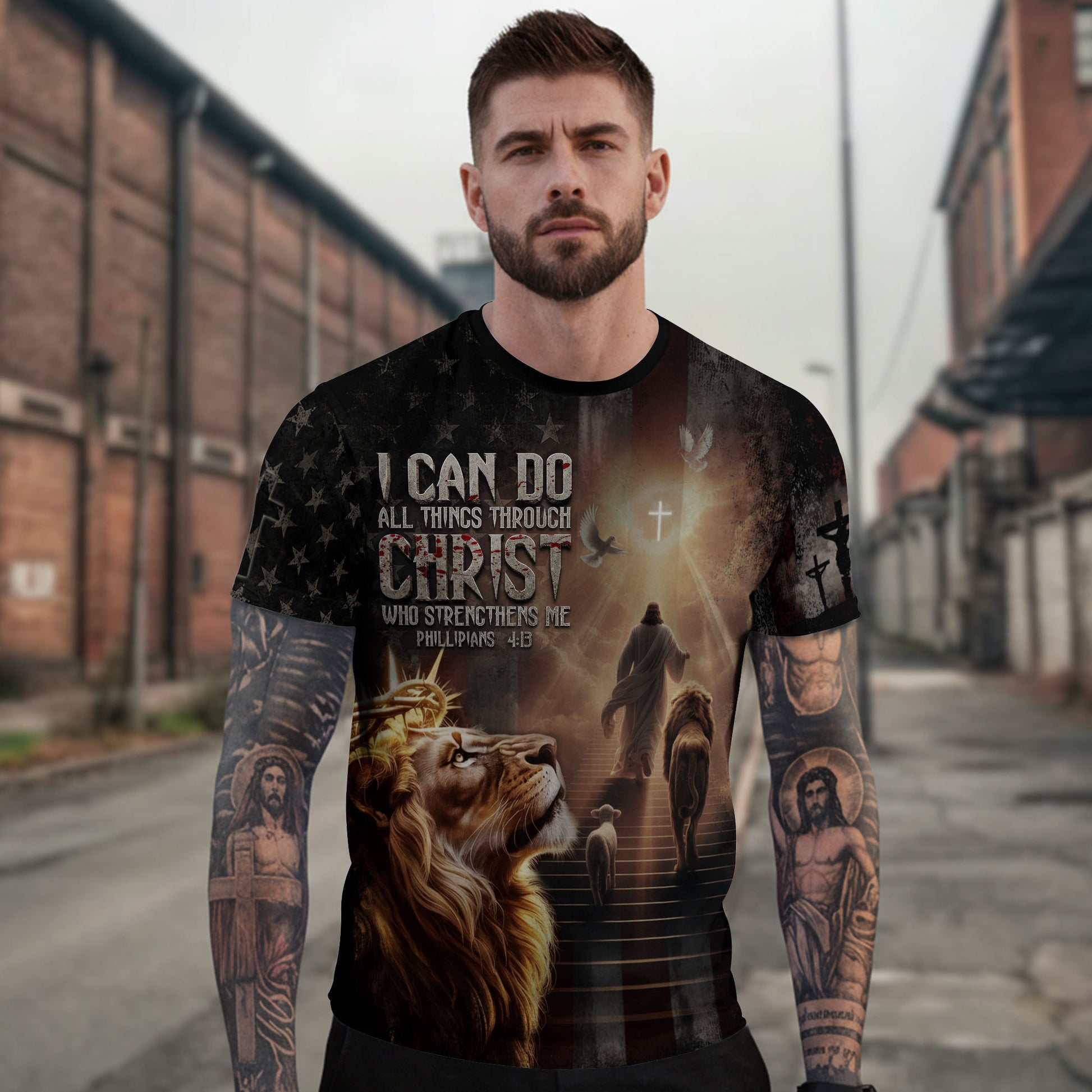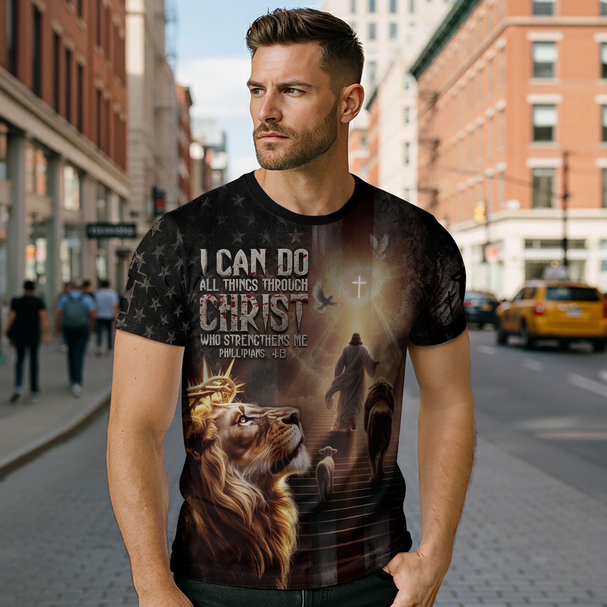 Inspirational Christian T-Shirt featuring Jesus and the crowned Lion of Judah on the American flag — a bold reminder of Philippians 4:13 and faith that strengthens every believer.