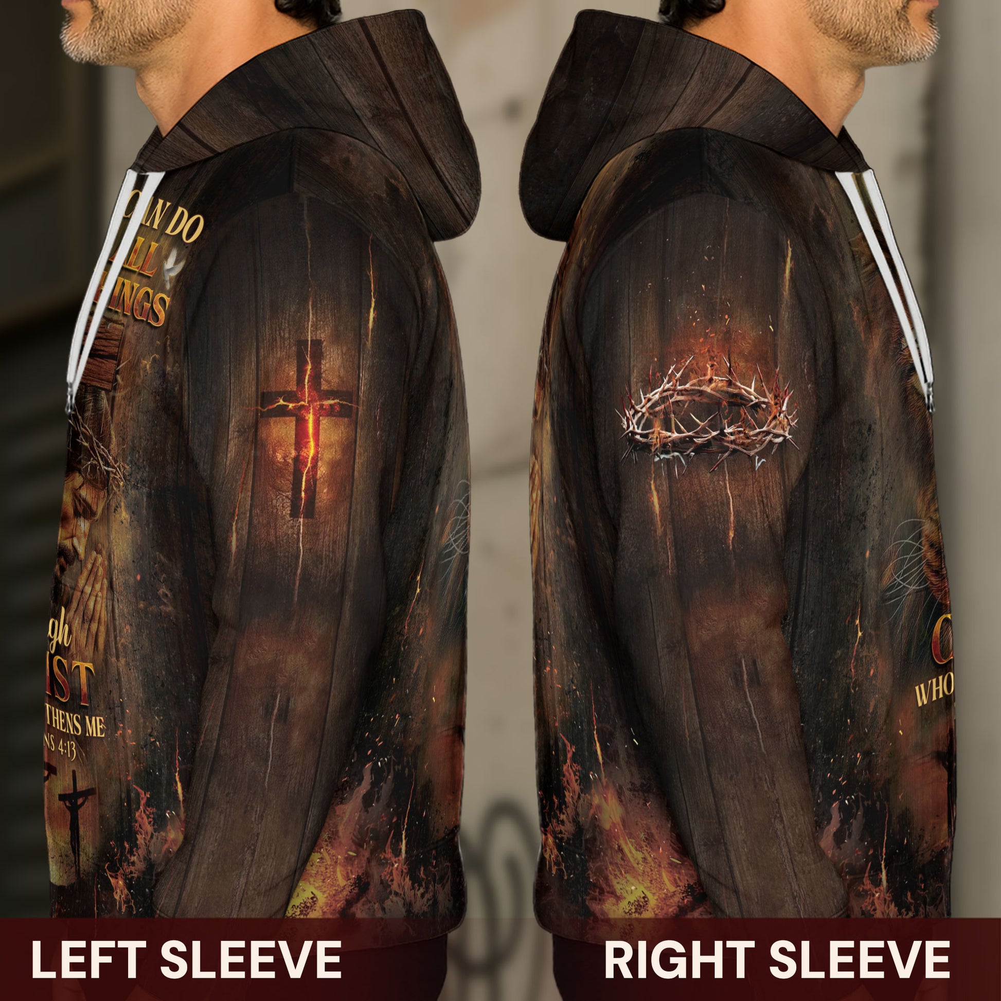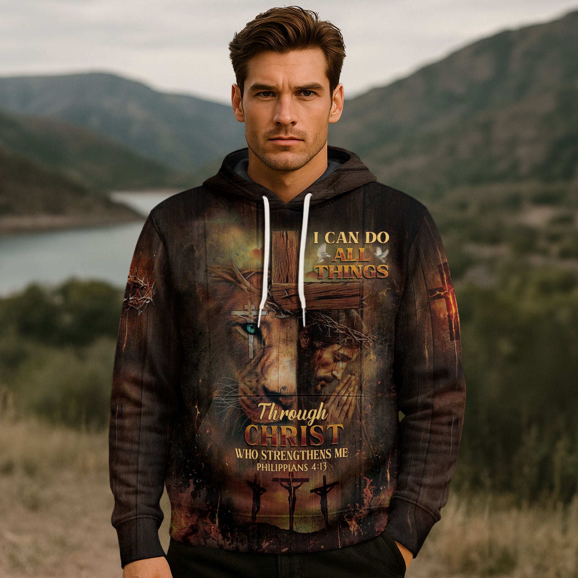 Powerful Christian hoodie featuring the inspiring Philippians 4:13 verse — “I can do all things through Christ who strengthens me.” Showcases a striking Lion of Judah and Jesus design, symbolizing divine courage, strength, and victory through faith. A bold statement of belief and perseverance for everyday wear.