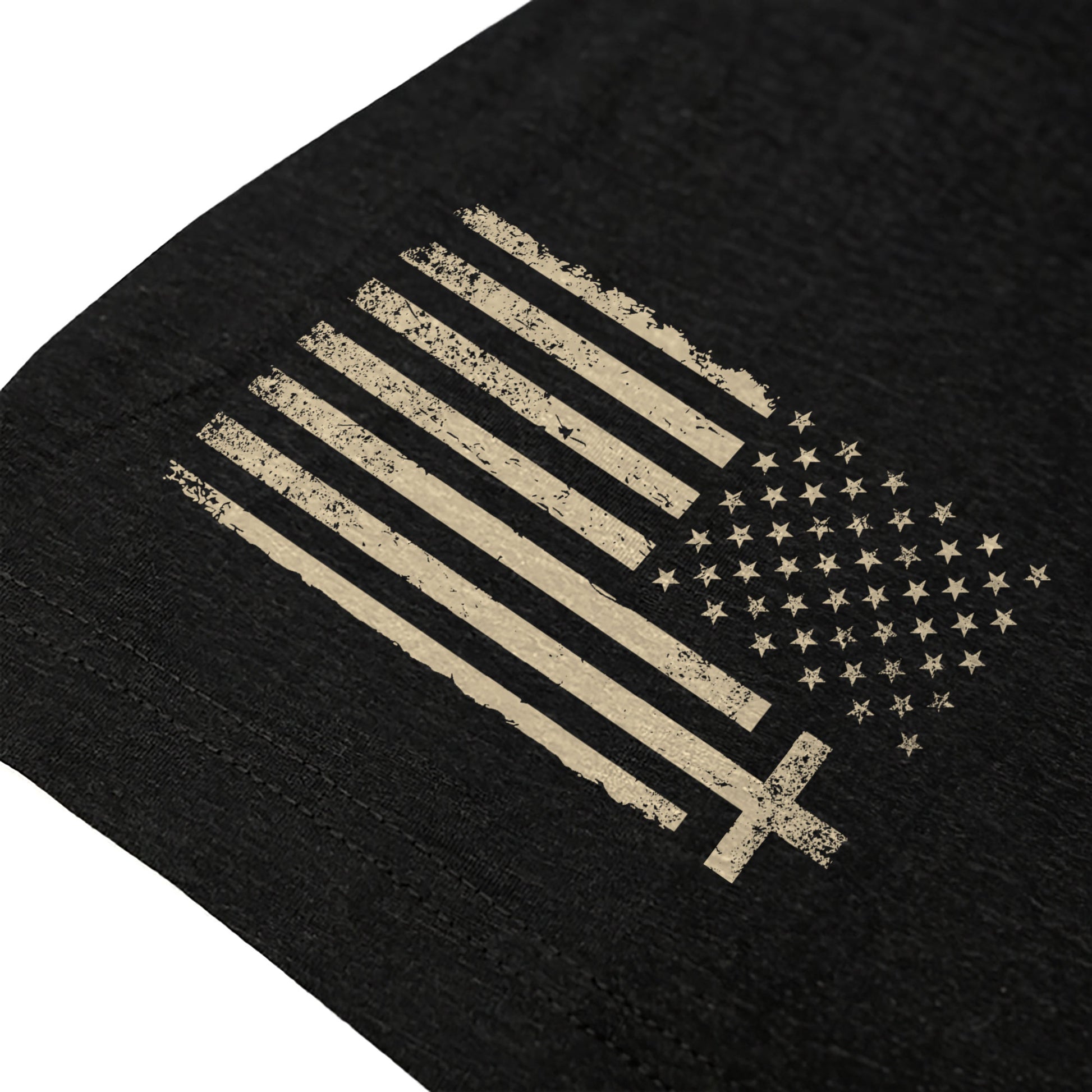 This patriotic Christian T-Shirt carries the message “I Can’t But I Know A Guy” displayed over a rugged wooden cross wrapped in barbed wire and styled with the American flag. Behind it, a weathered black-and-white flag adds a bold patriotic backdrop. A powerful design that unites faith and freedom, symbolizing reliance on Christ’s strength and the values of God and country.