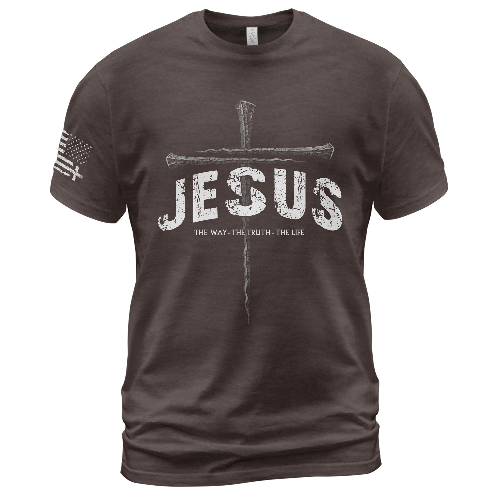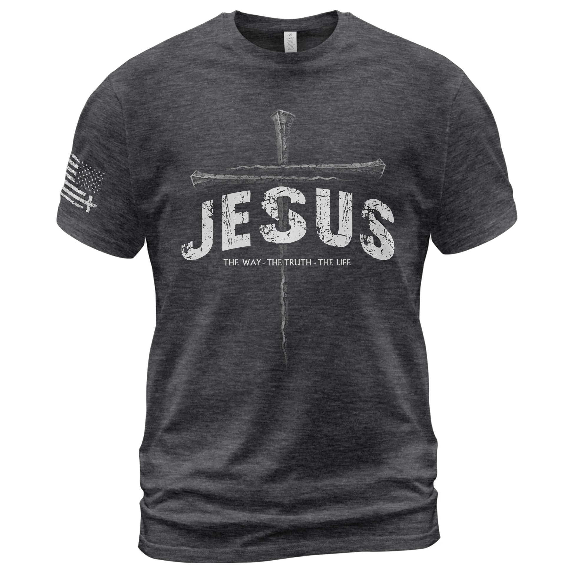 Christian T-shirt with rugged nail cross design and bold JESUS. Features verse “The Way, The Truth, The Life.” Perfect faith apparel for believers, church, and Christian gifts.