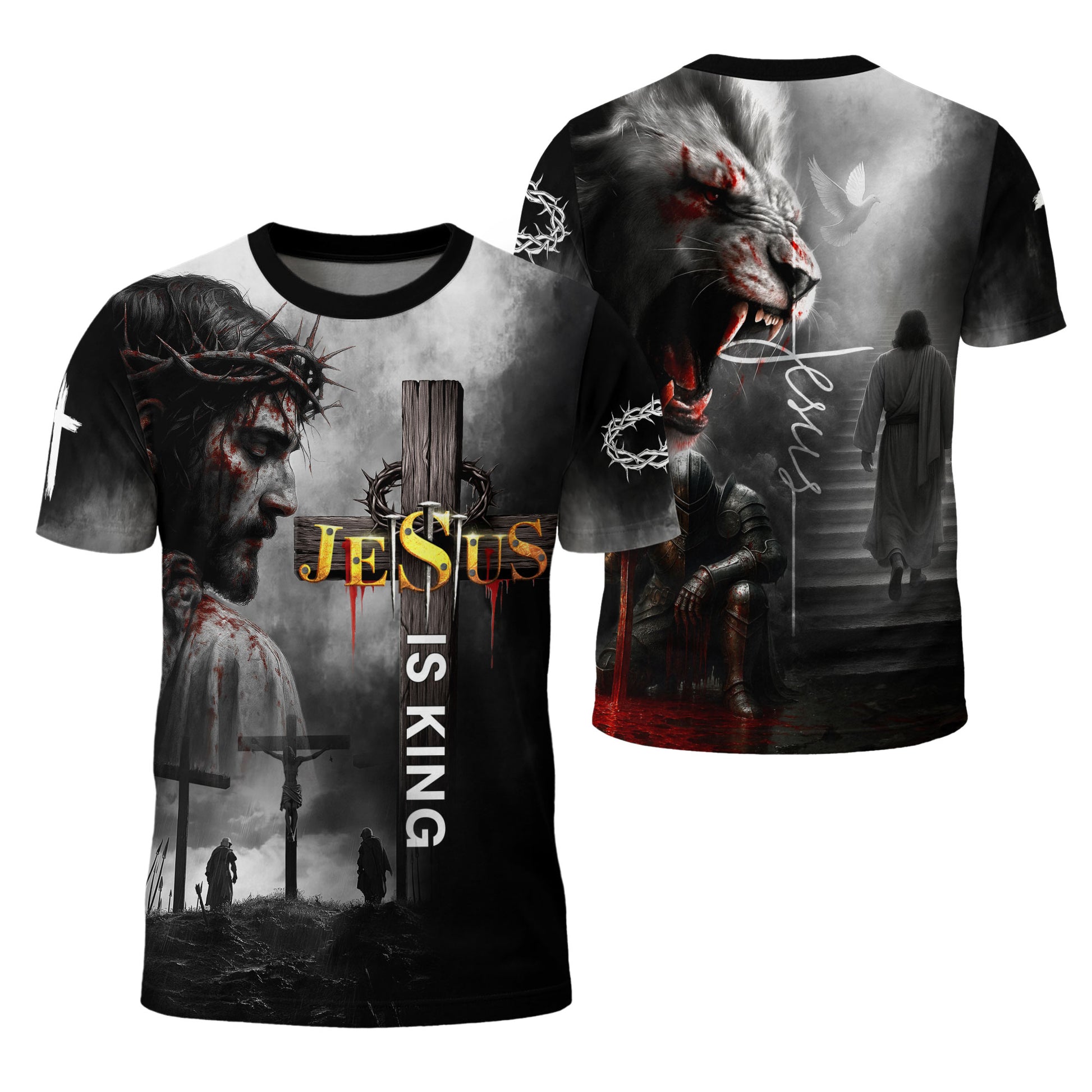 Powerful full-print Christian T-Shirt featuring Jesus crowned with thorns, fiery lion, cross, and warrior imagery. Bold “Jesus Is King” design inspires unshakable faith and strength!