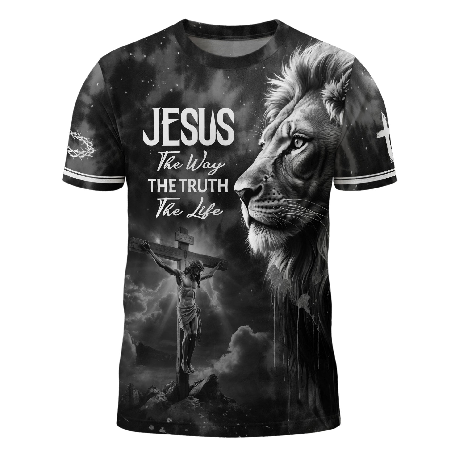 Bold monochrome Christian design featuring Jesus with a crown of thorns, the Lion of Judah, and the crucifix. This “The Way, The Truth, The Life” t-shirt symbolizes unwavering faith, sacrifice, and the power of redemption.