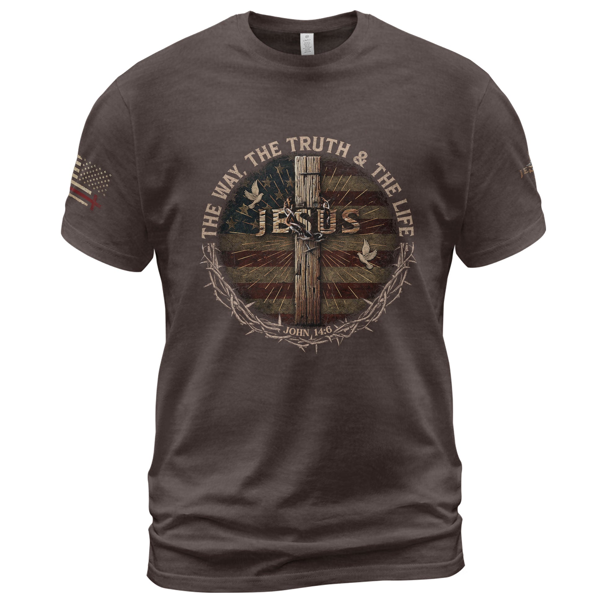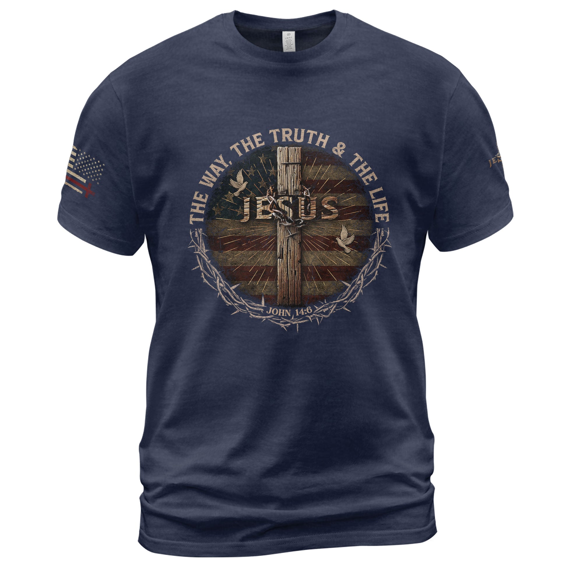 No shortcuts. No compromise. Just Jesus. Crowned in thorns, wrapped in glory, and set before the stripes of freedom — this shirt declares the only path that leads to life eternal: John 14:6.