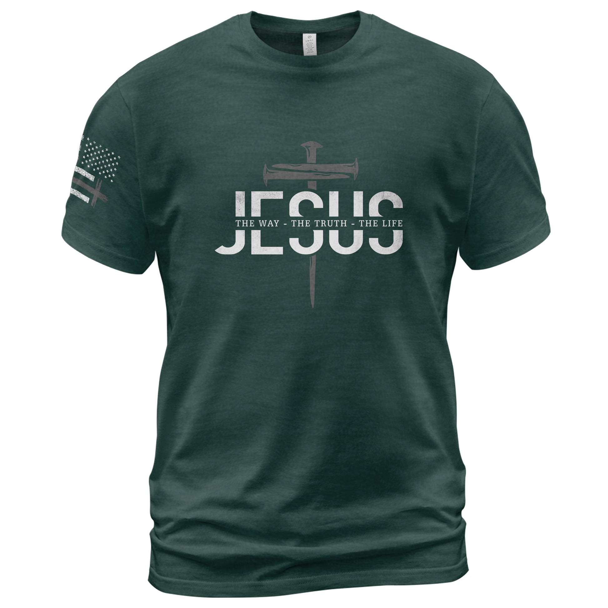 Christian t shirt with bold JESUS lettering and cross nail artwork. Features the verse The Way The Truth The Life, perfect faith based apparel for believers.
