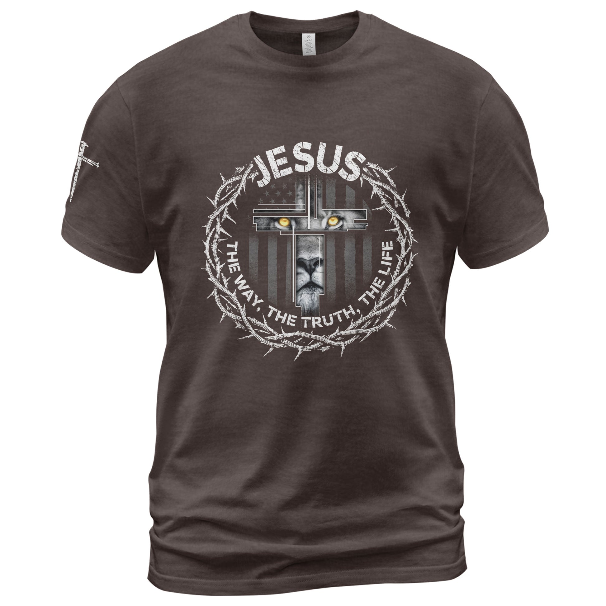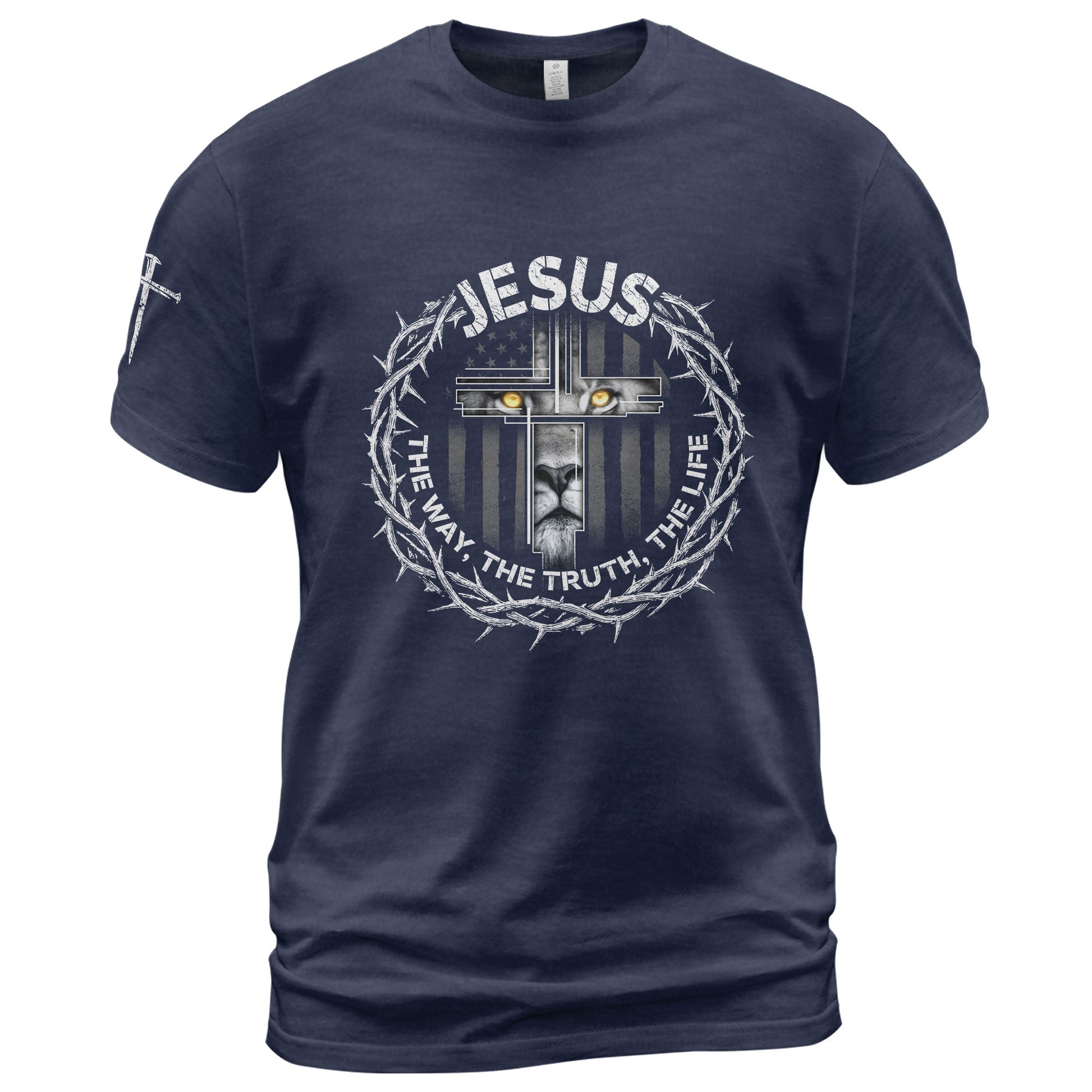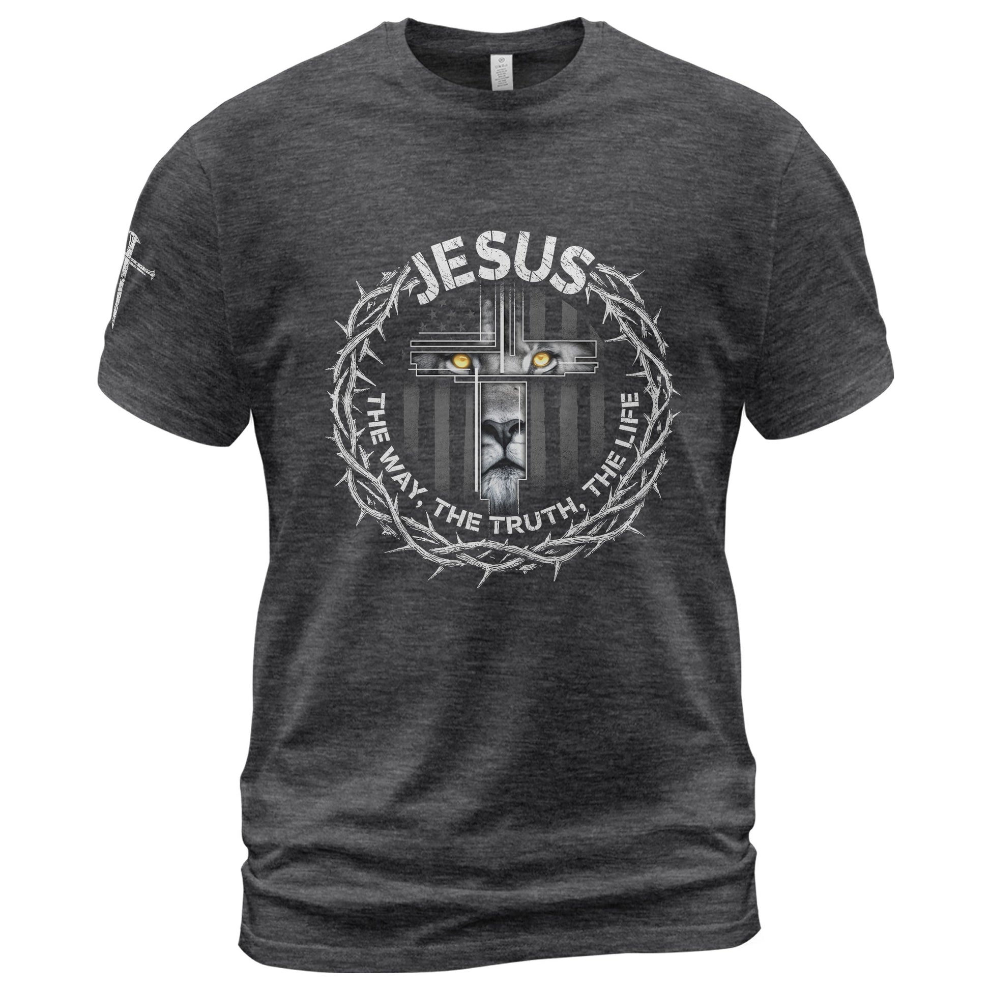 Powerful Christian T-Shirt with crown of thorns, lion cross and John 14:6 verse – Jesus The Way, The Truth, The Life. Faith in style!