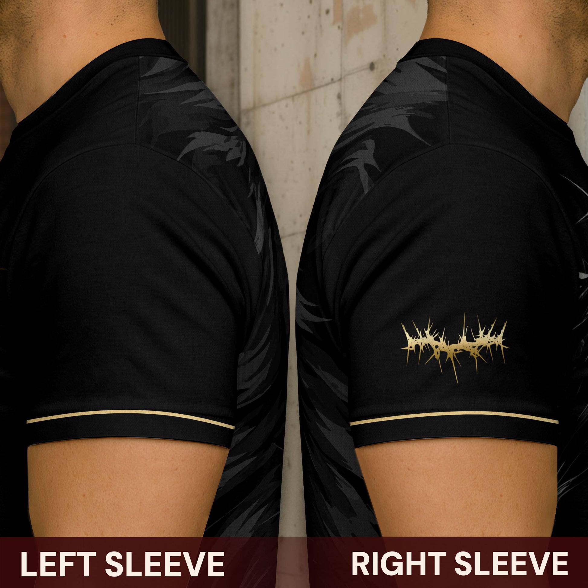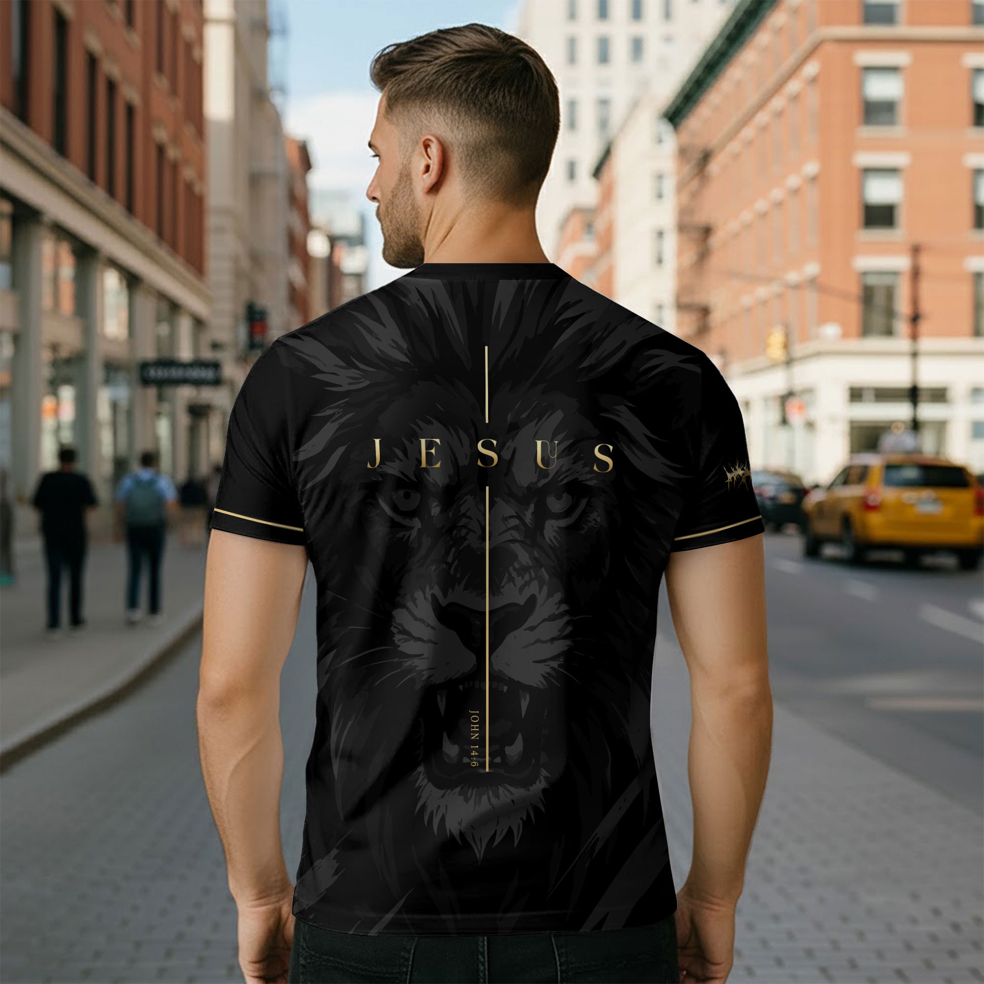 A powerful Christian T-Shirt with golden cross design, Jesus with crown of thorns, and Lion of Judah on the back. A bold declaration of faith in Christ.