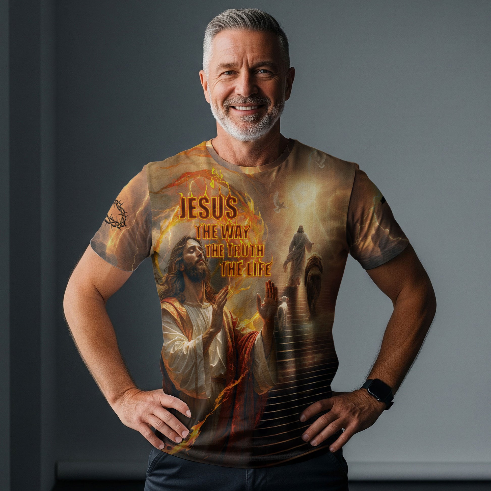 Crafted with durable polyester and eco-friendly sublimation inks, our shirts are soft on your skin, long-lasting, and gentle on the planet—faith-driven fashion built to inspire and endure.