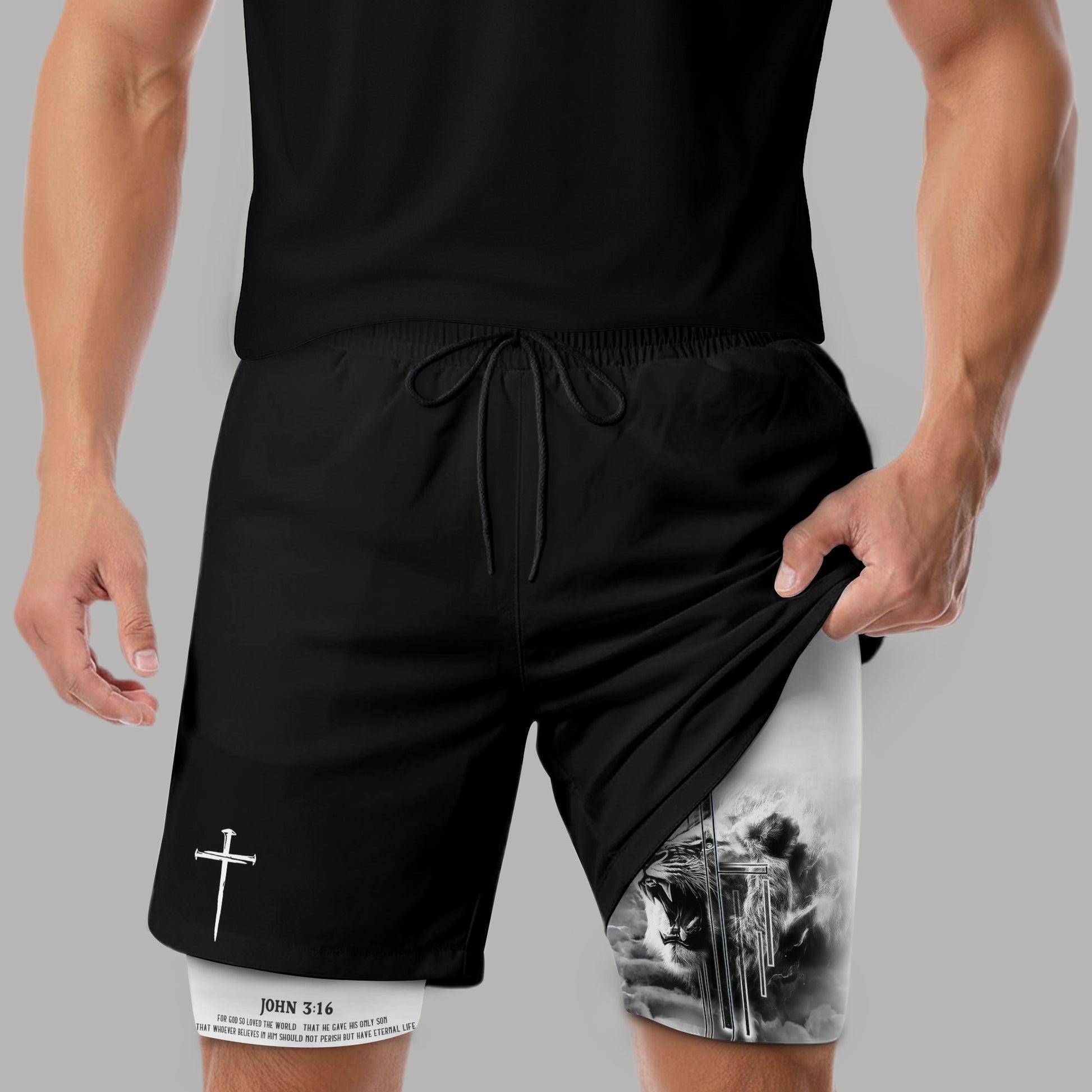 John 3 16 Christian Gym Shorts for Men Lion Cross Bible Verse