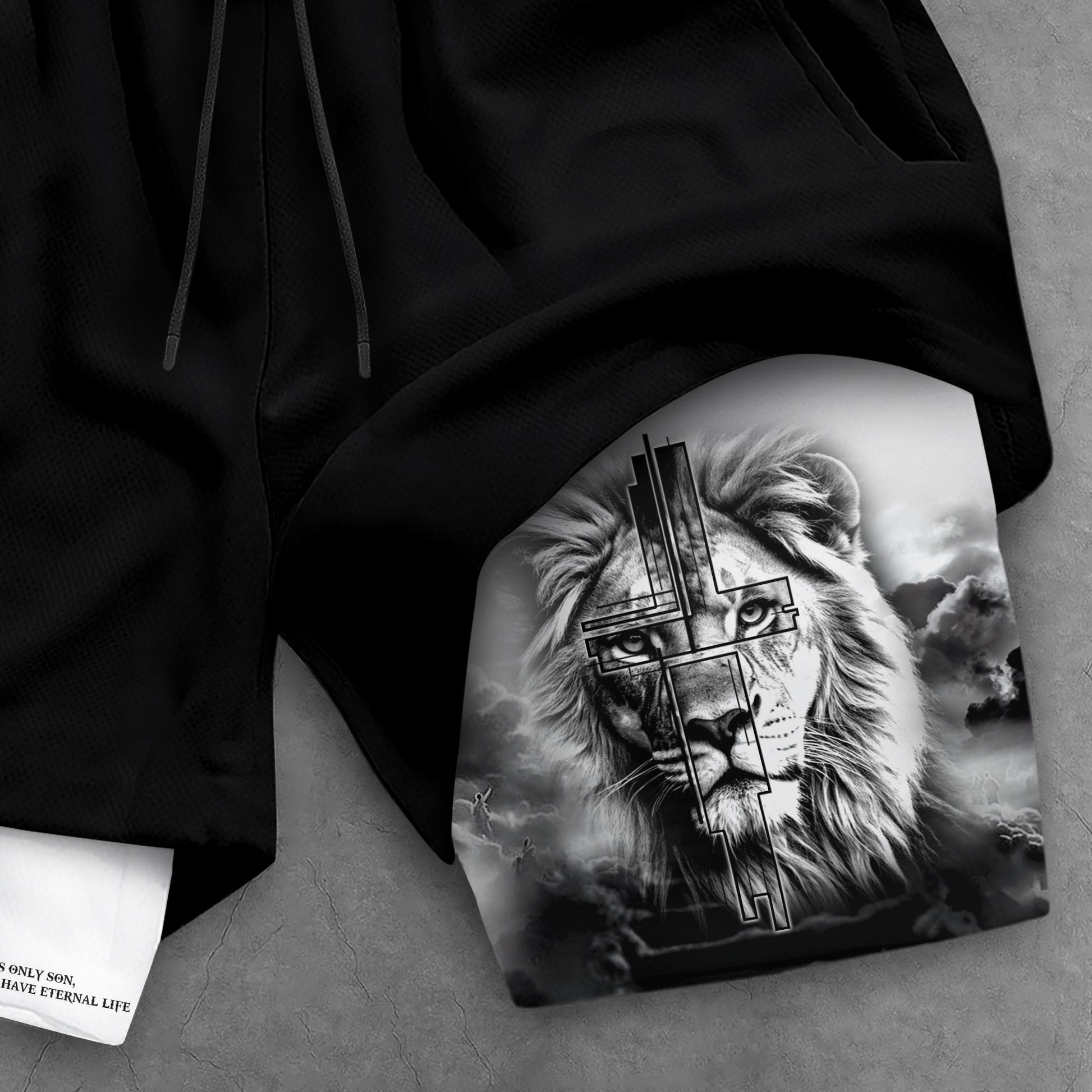 Christian gym shorts with lion and cross design inspired by John 3 16 Perfect for men of faith who train with strength and purpose