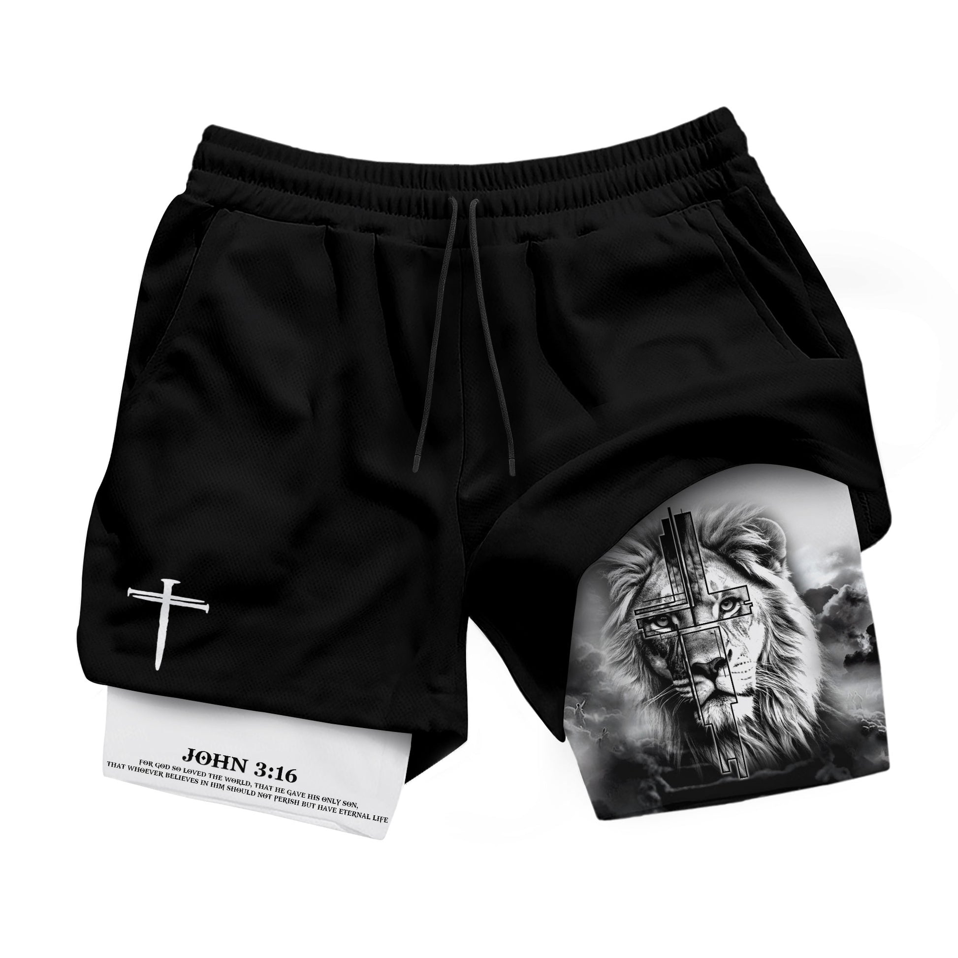 John 3 16 Christian Gym Shorts for Men Lion Cross Faith Shorts
