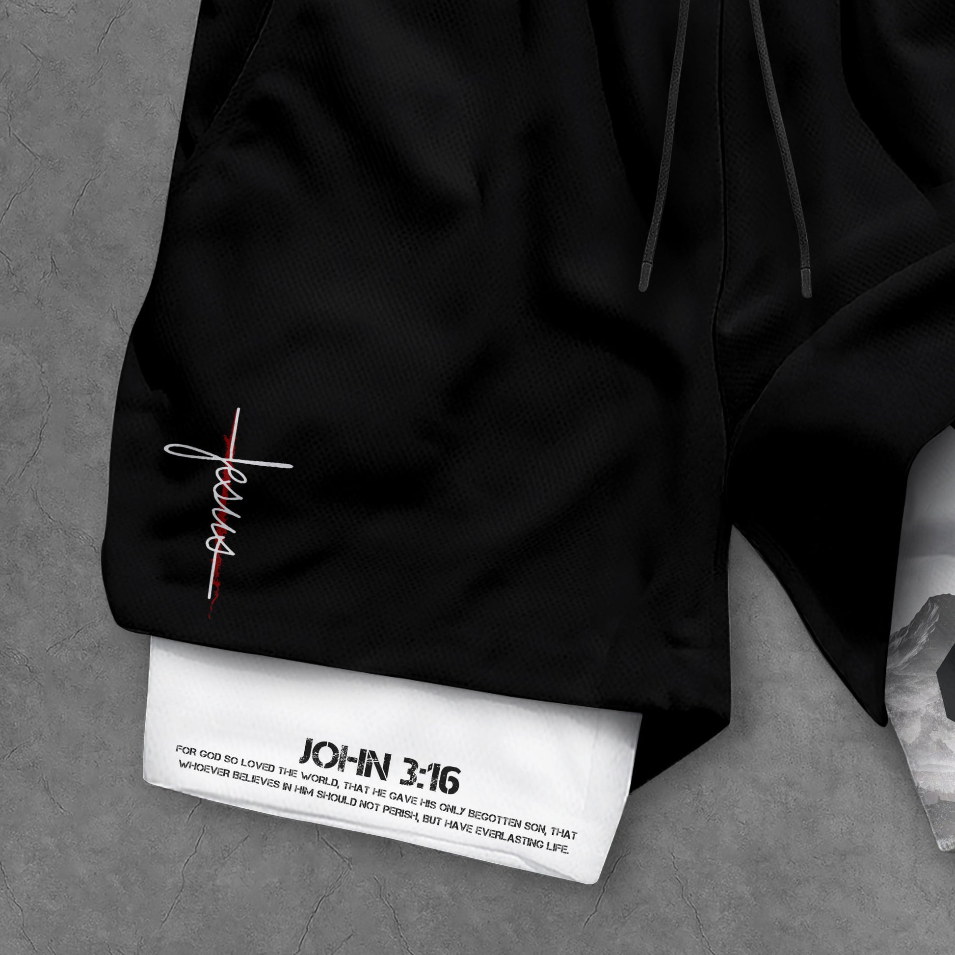 John 3:16 Christian Gym Shorts for Men with Liner Jesus Cross Design Religious