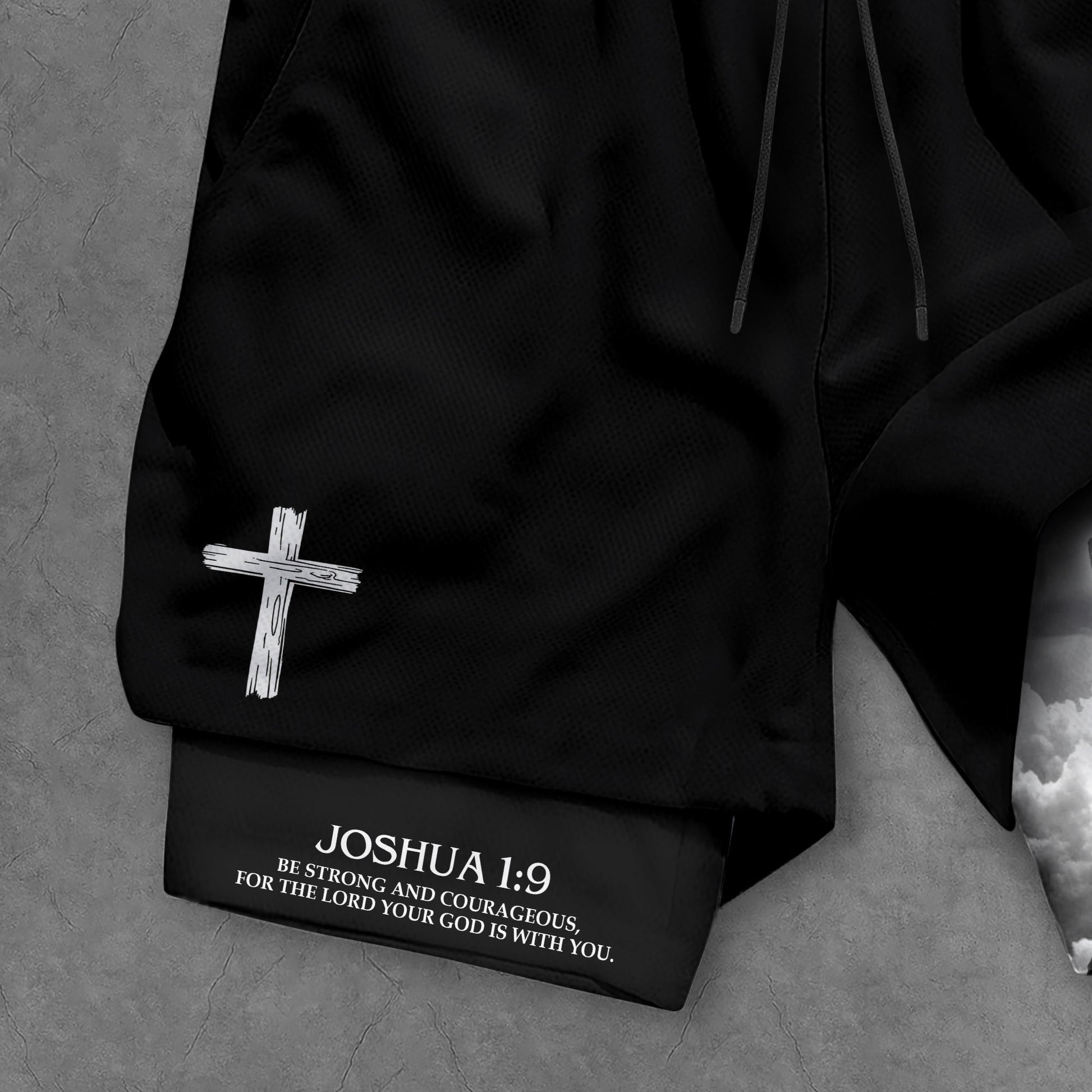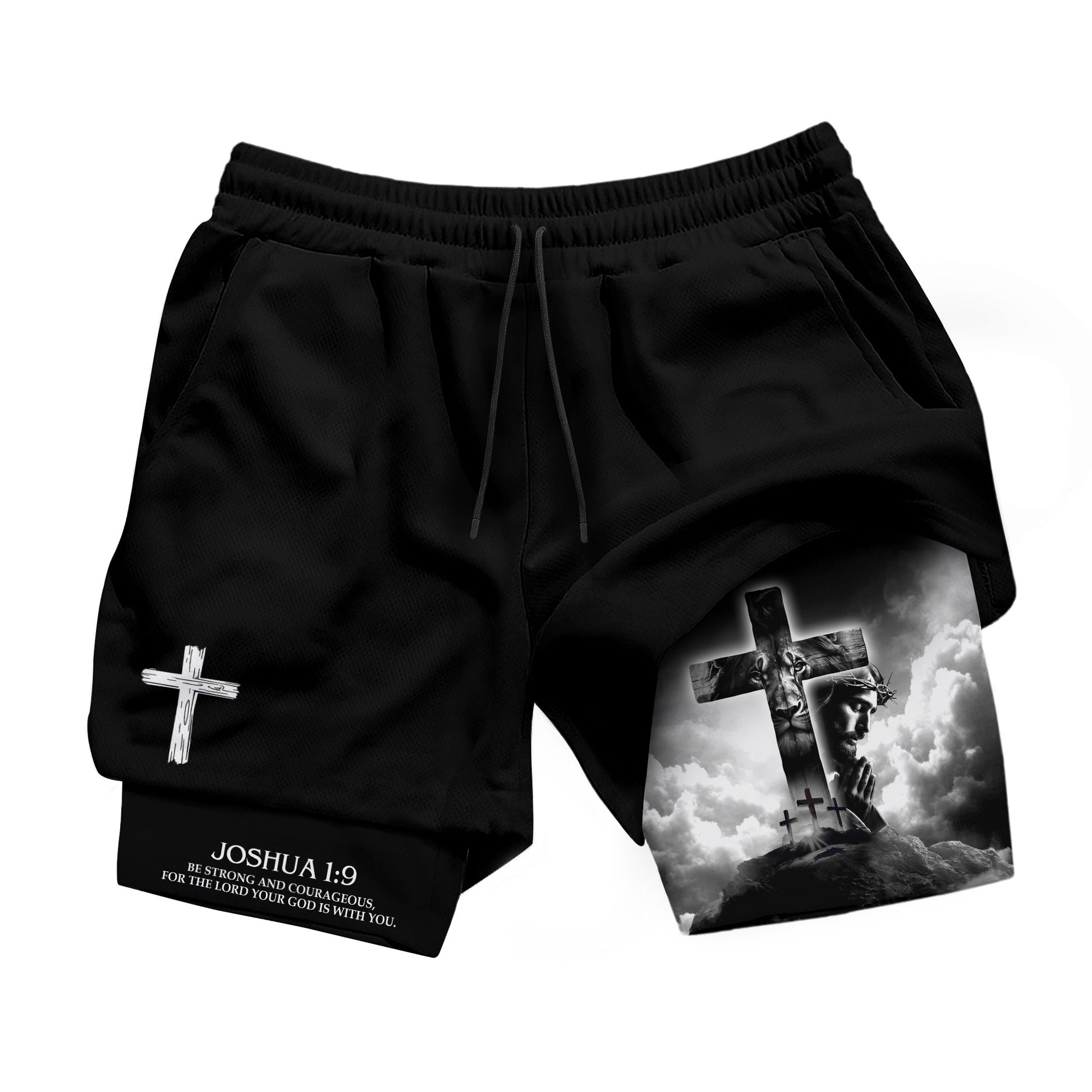 Christian gym shorts featuring Joshua 1 9 with Jesus cross and prayer design A bold reminder of strength faith and courage