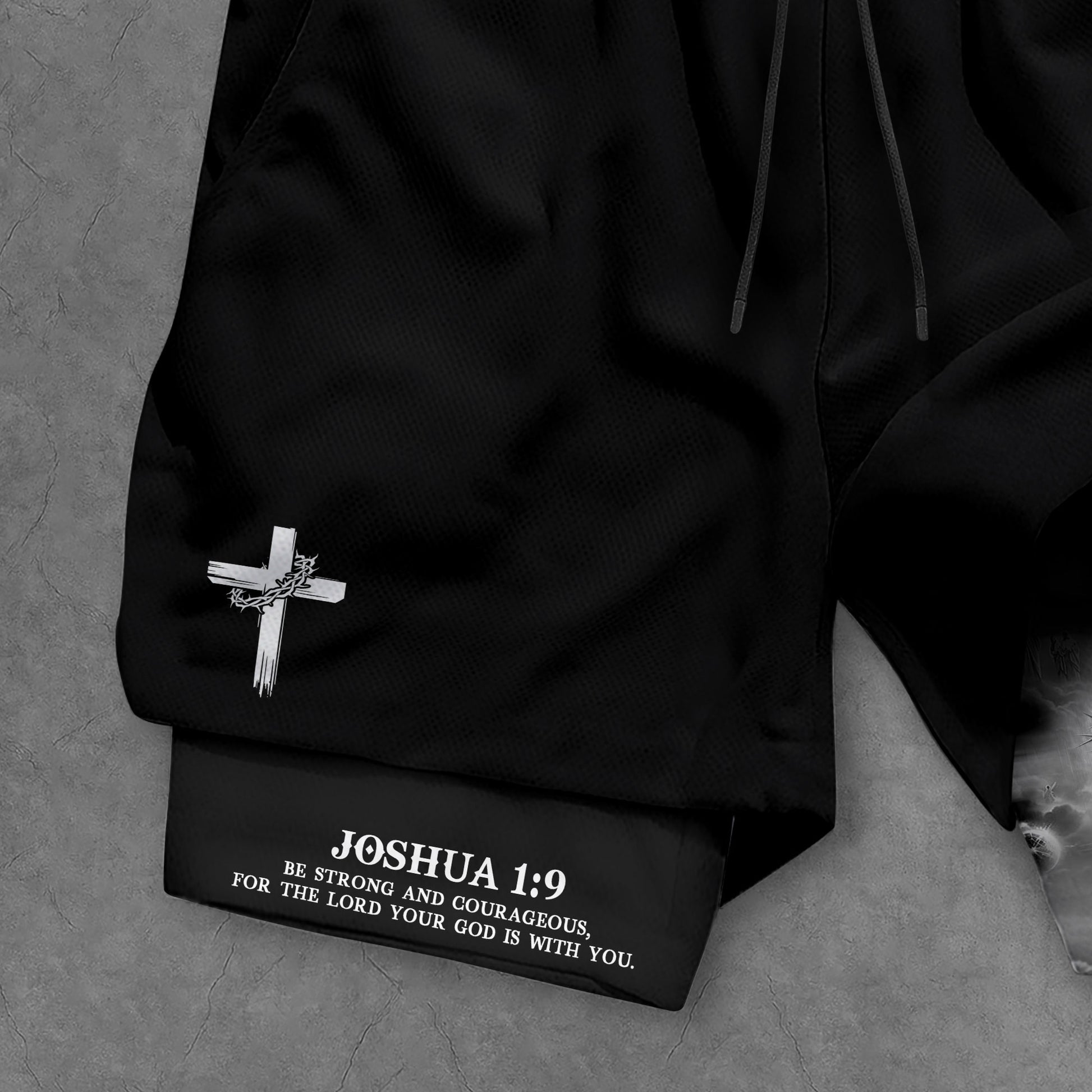 Christian gym shorts featuring Joshua 1 9 with a Jesus and lion cross design A bold symbol of faith courage and strength for Christian men