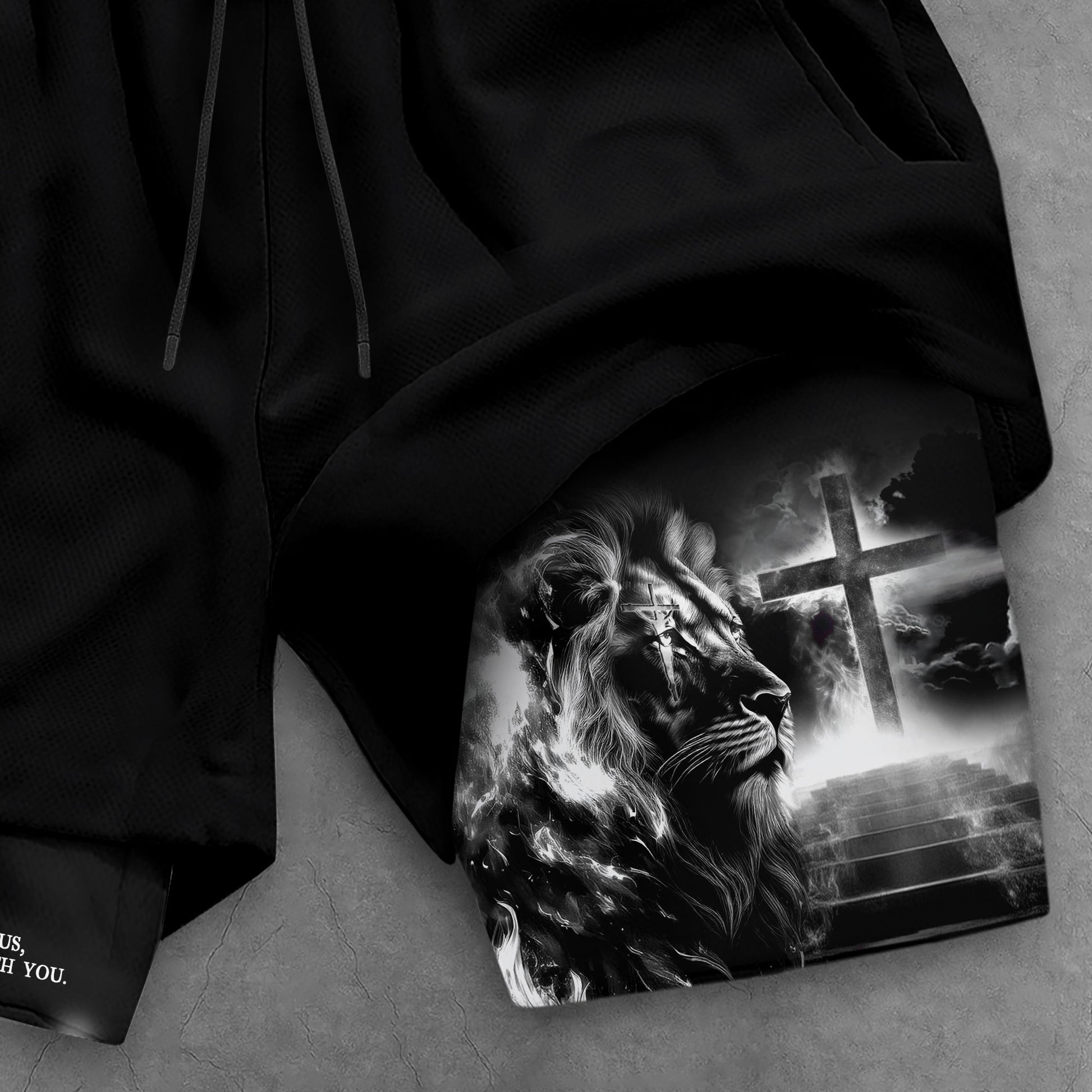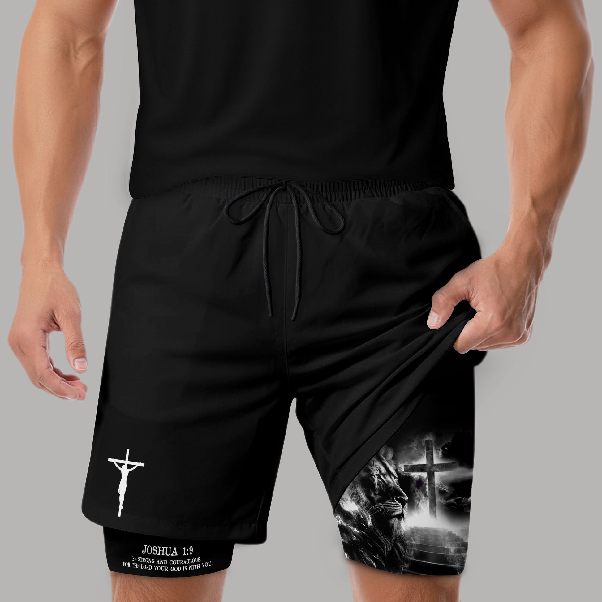 Joshua 1 9 Christian Gym Shorts for Men Lion Cross Crucifix Design