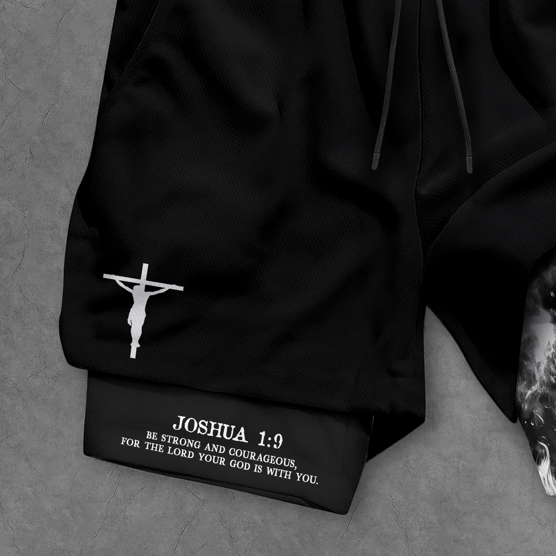 Christian gym shorts featuring Joshua 1 9 with a lion and crucifix cross design A bold symbol of courage strength and unshakable faith