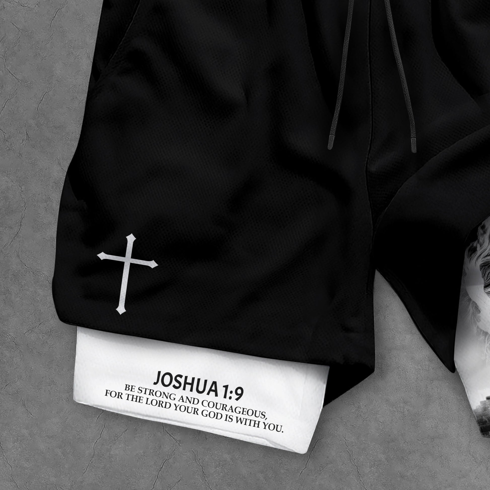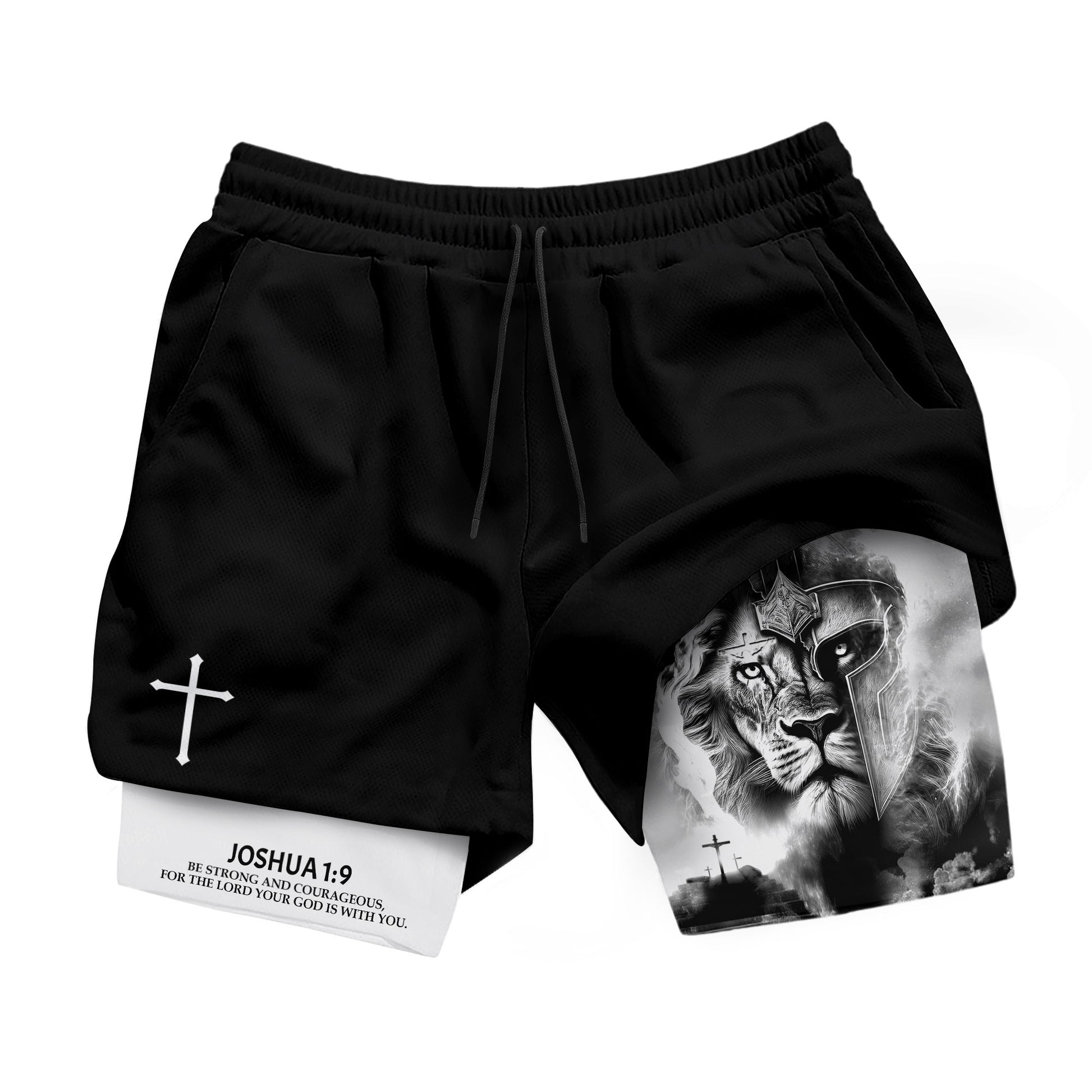 Christian gym shorts featuring Joshua 1 9 with lion warrior cross design Symbol of strength courage and unshakable faith