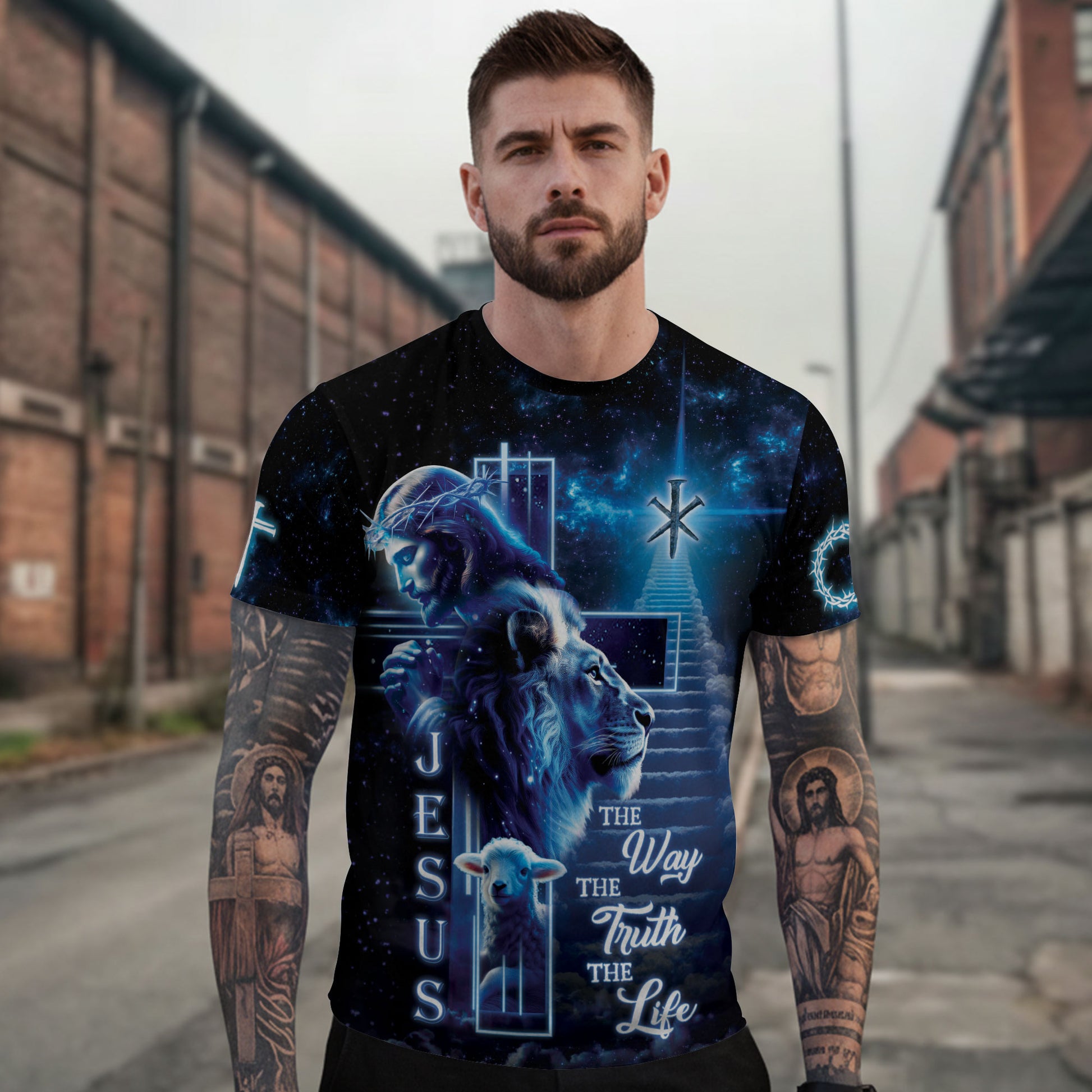 Galactic Christian tee with Lion and Lamb, cross, and Christ crowned in glory. Declare Jesus as the Way, the Truth, and the Life in cosmic boldness.