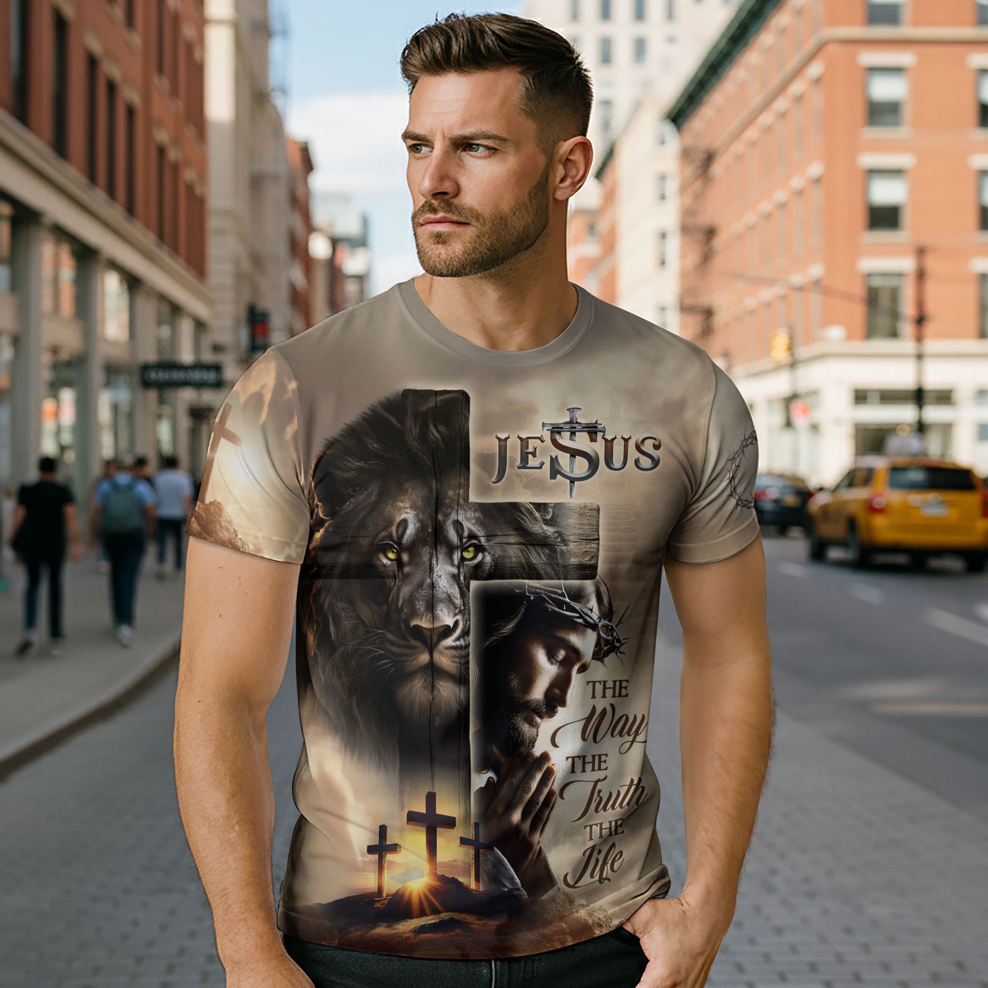 Vintage Christian shirt with Lion, Jesus, and the Cross at sunrise. Declare the message of John 14:6 in this bold resurrection-inspired faith tee.