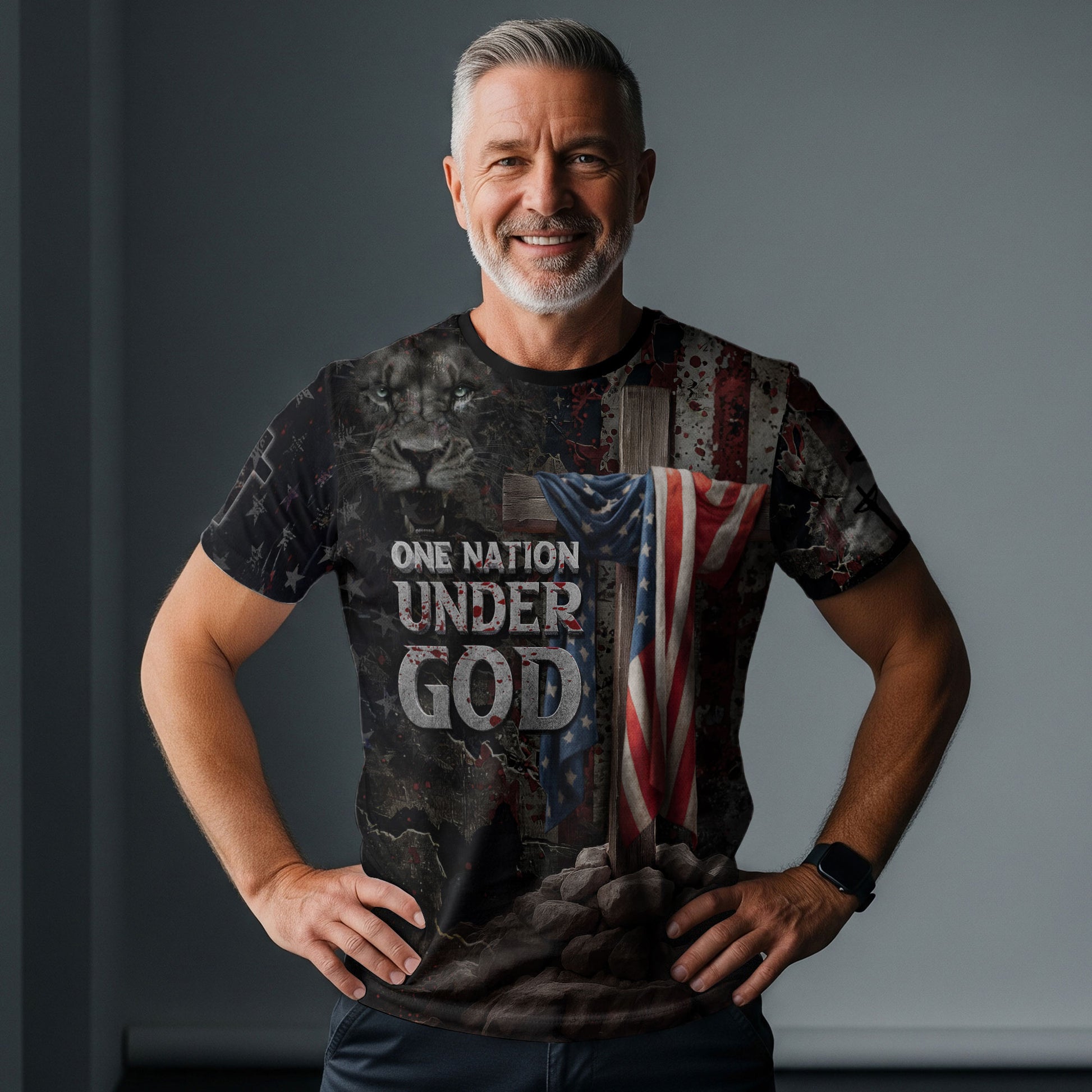 Boldly proclaim your faith and patriotism with the One Nation Under God Lion & Cross T-Shirt. Featuring a powerful lion’s face blended with the American flag and a rugged wooden cross draped with the Stars and Stripes, this shirt embodies courage, freedom, and faith. The back design highlights the majestic lion crowned in strength, symbolizing Jesus as the Lion of Judah. Perfect for those who stand firm in both their faith and love for country, this shirt carries a timeless message of unity under God.