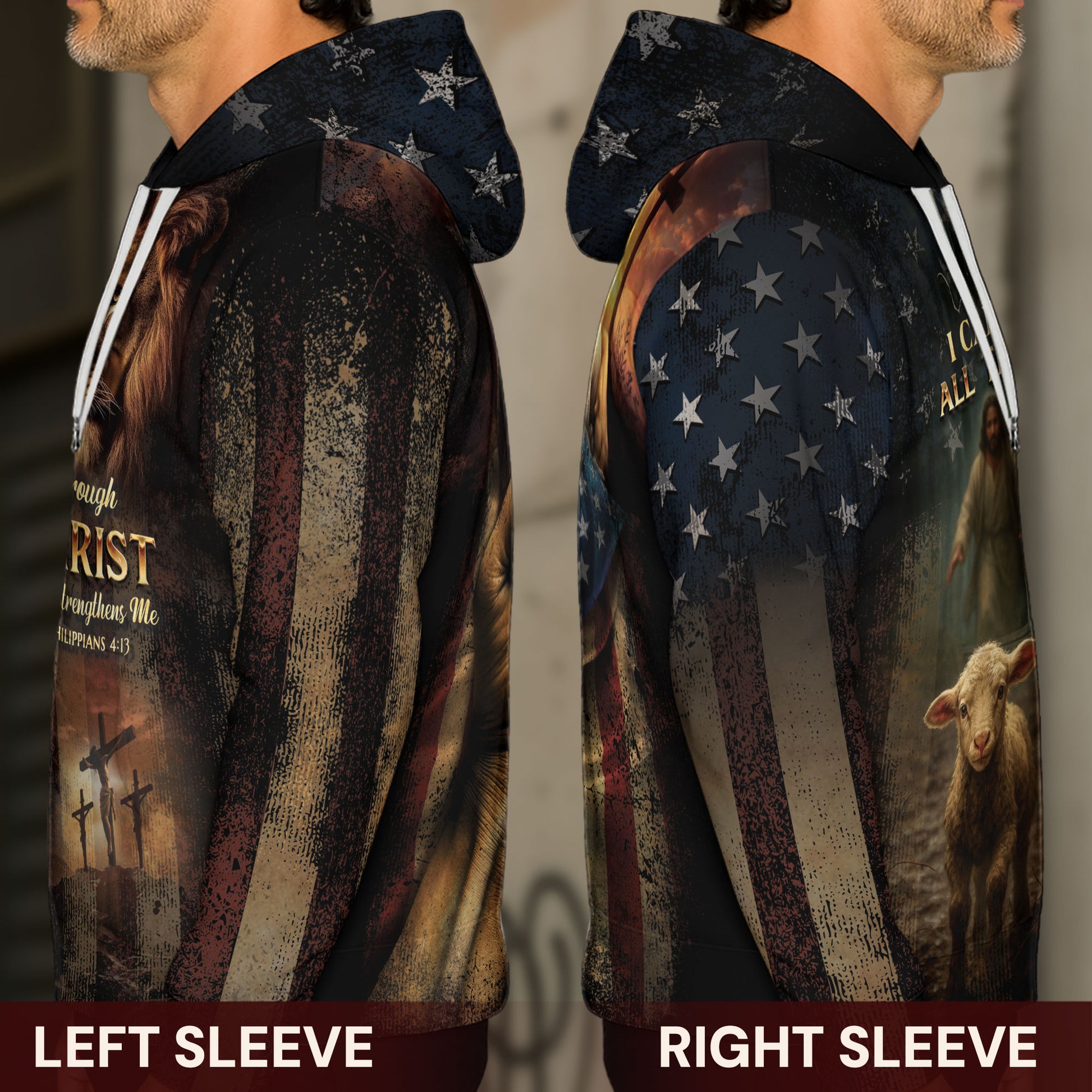 Powerful 3D Christian hoodie uniting the Lion of Judah, Jesus, and the Lamb beneath the American flag — a striking symbol of divine strength and grace. Featuring Philippians 4:13: “I can do all things through Christ who strengthens me.” Designed to inspire faith, courage, and devotion in every believer.