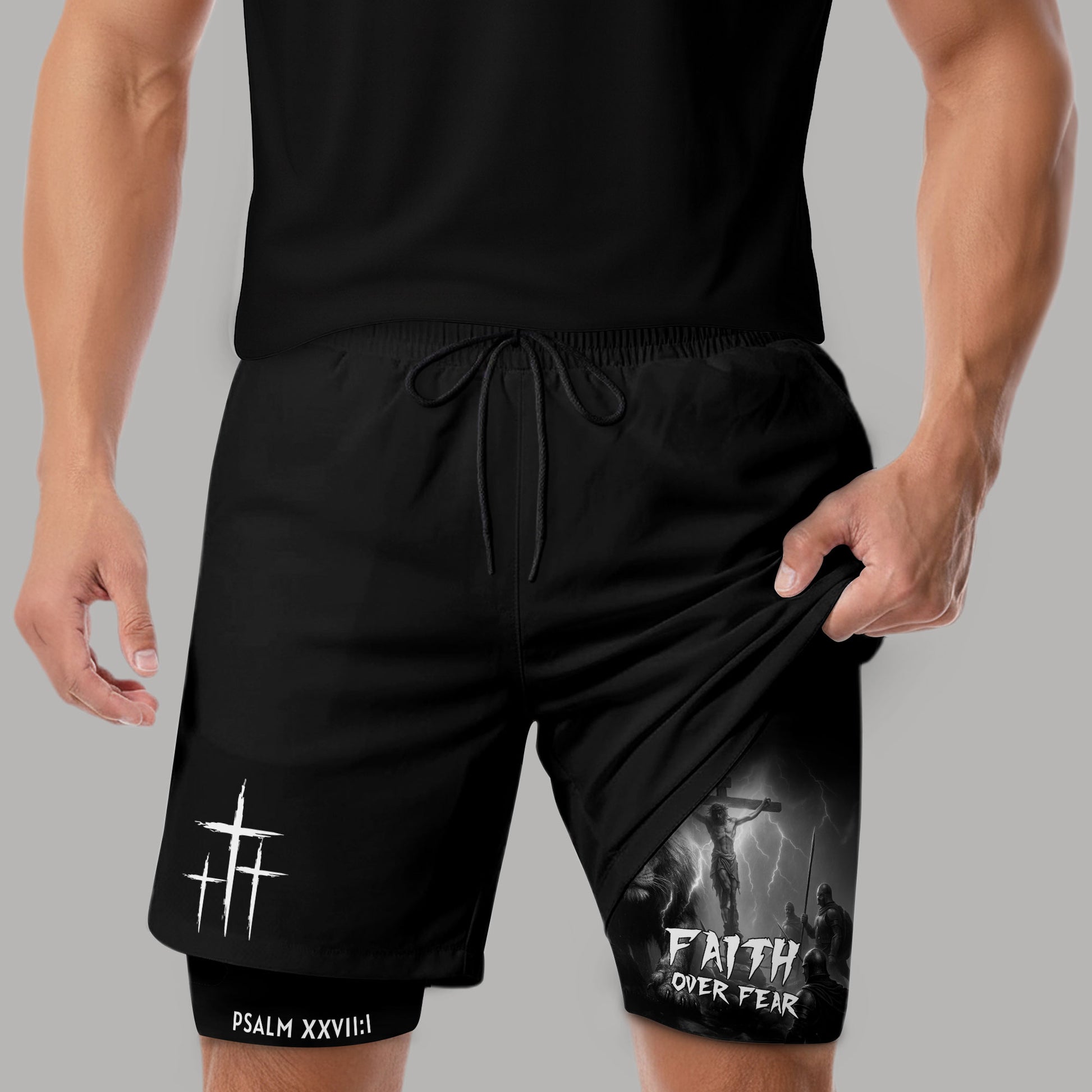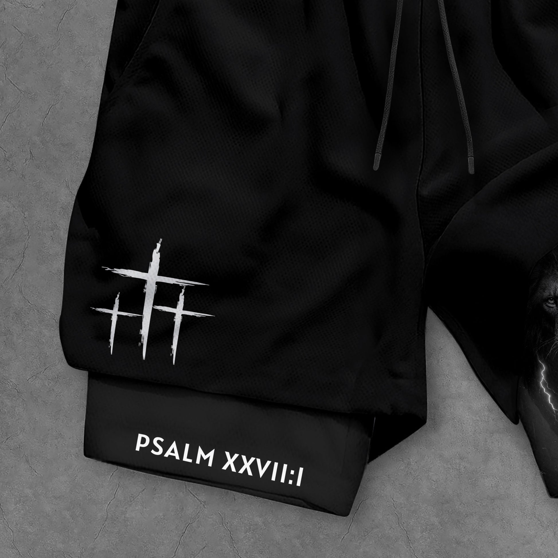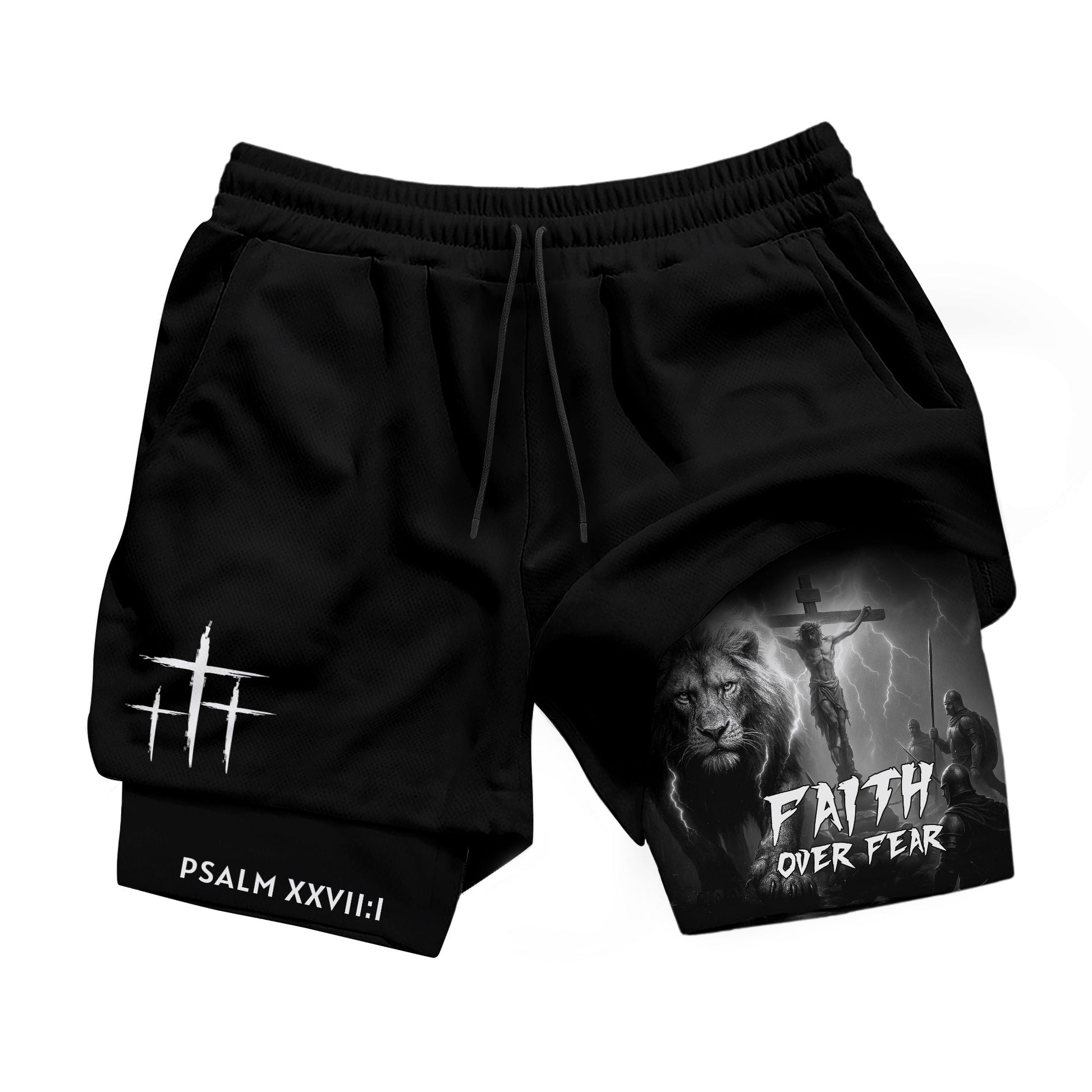 Psalm 27 1 Faith Over Fear Christian Gym Shorts Lion and Cross Design