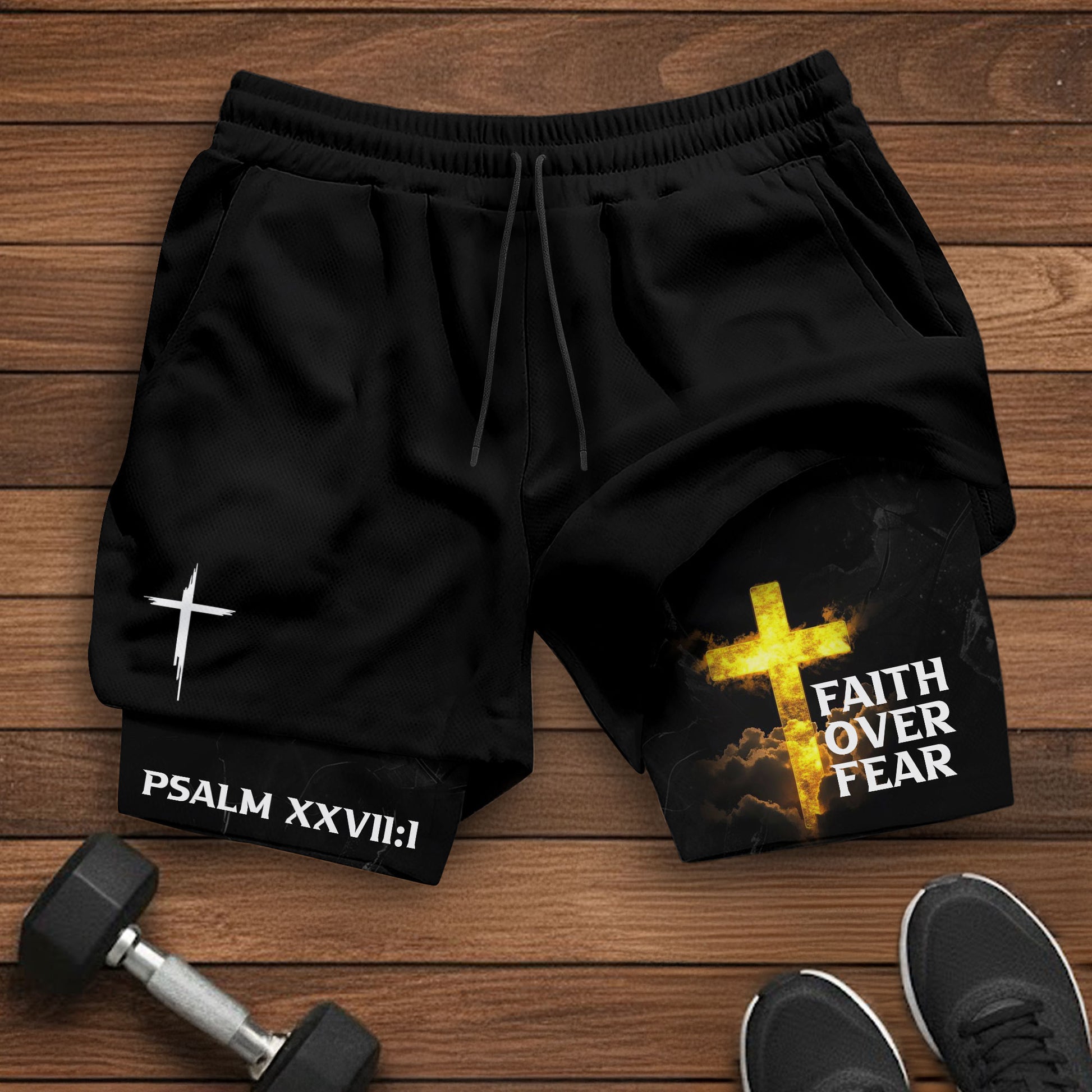 Psalm 27:1 Faith Over Fear Christian Mens Gym Shorts Bible Verse Glowing Gold Design
