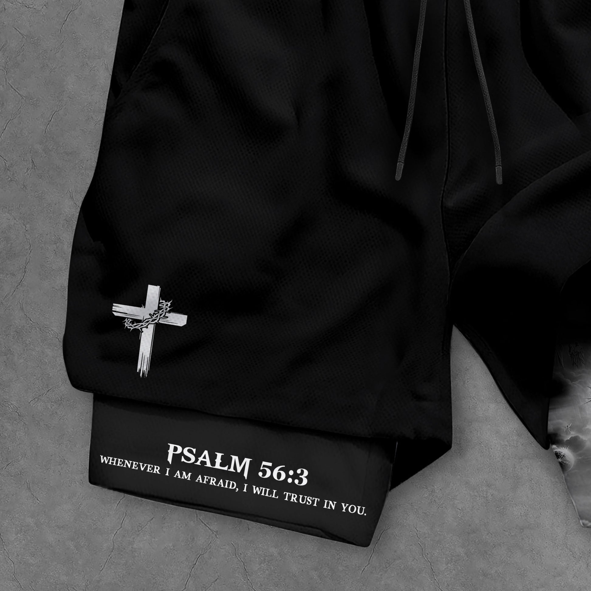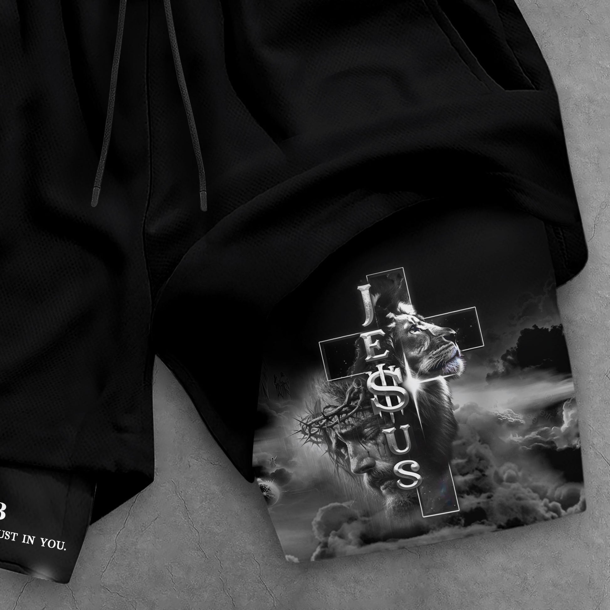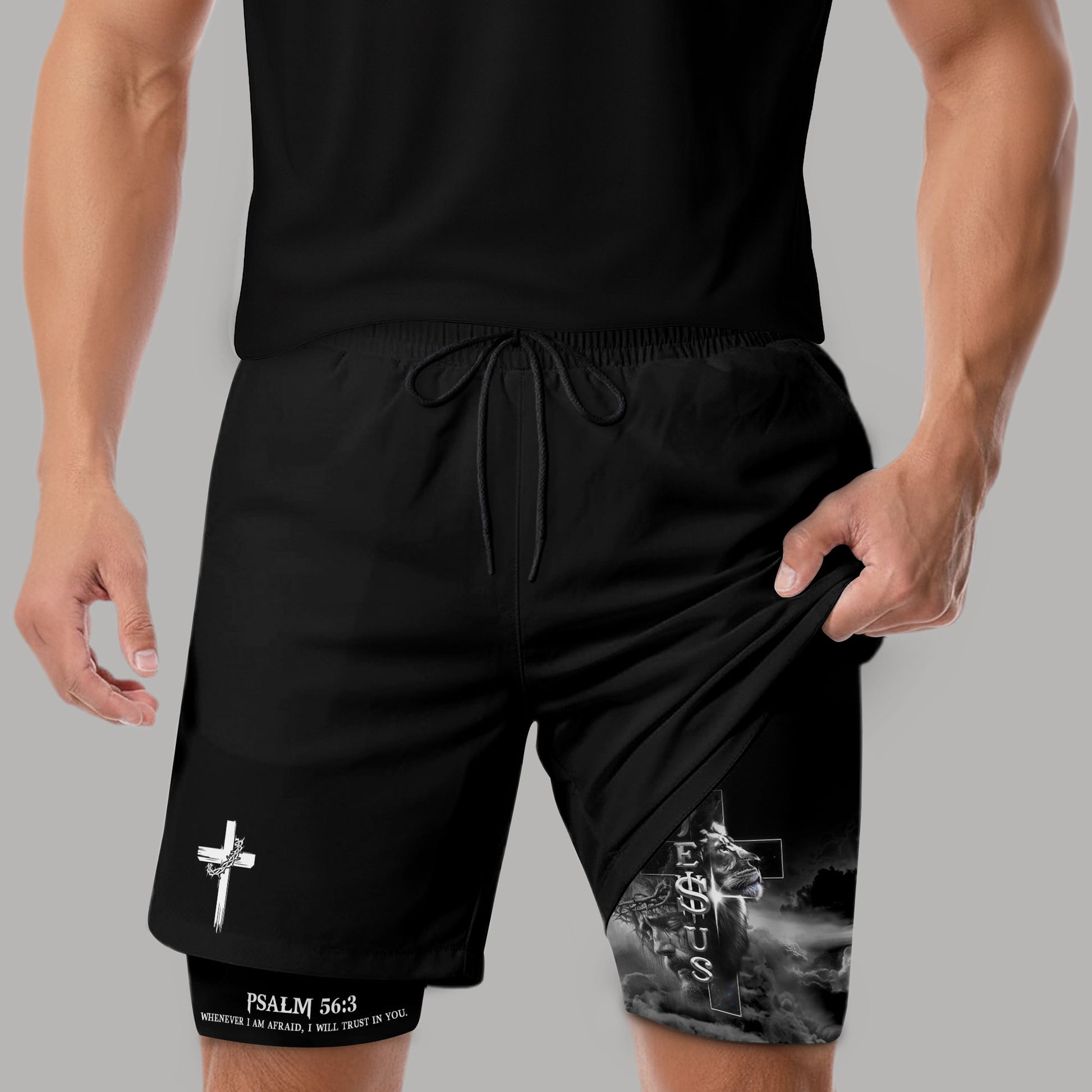 Christian gym shorts with Psalm 56 3 Jesus cross lion design A bold reminder to trust in God and live with fearless faith