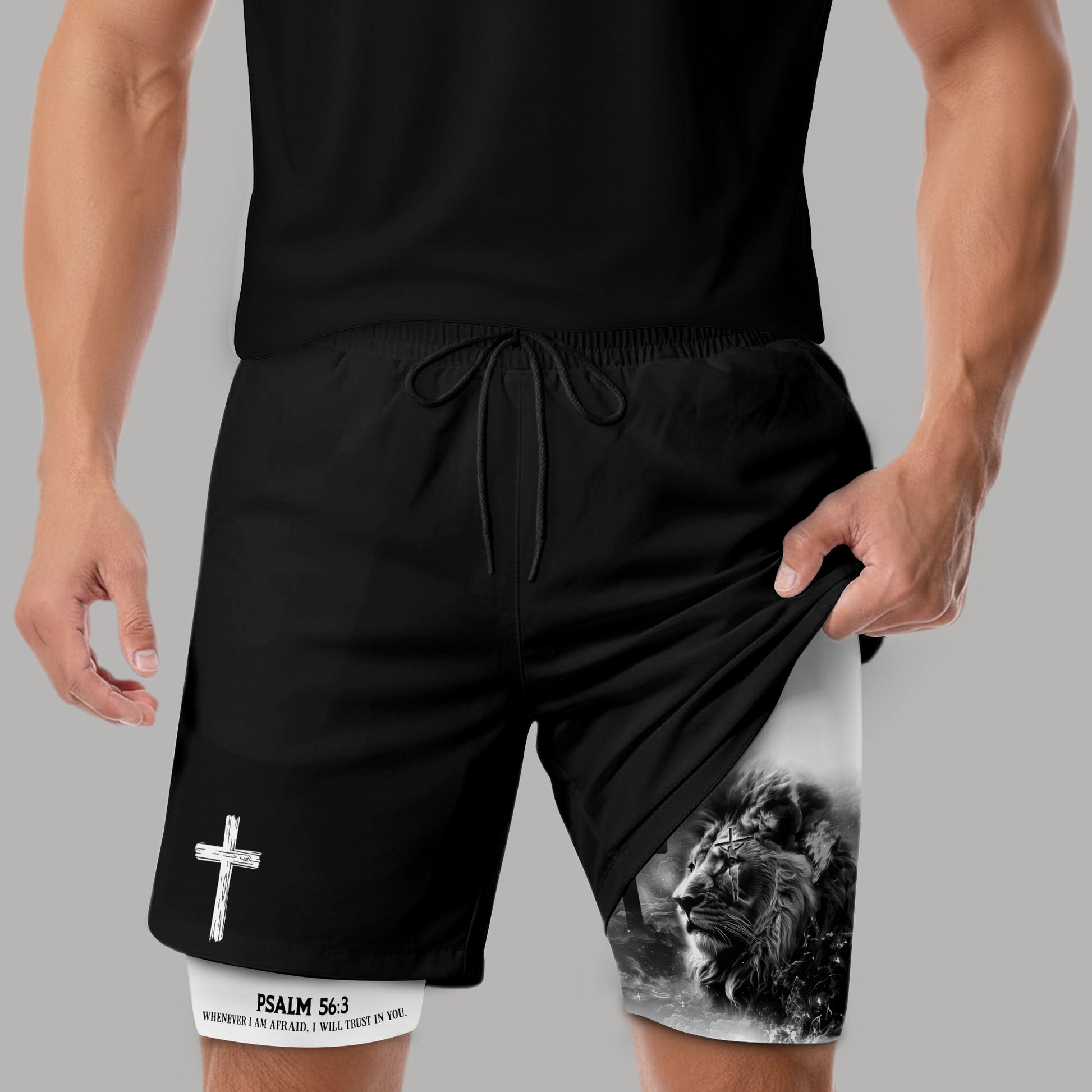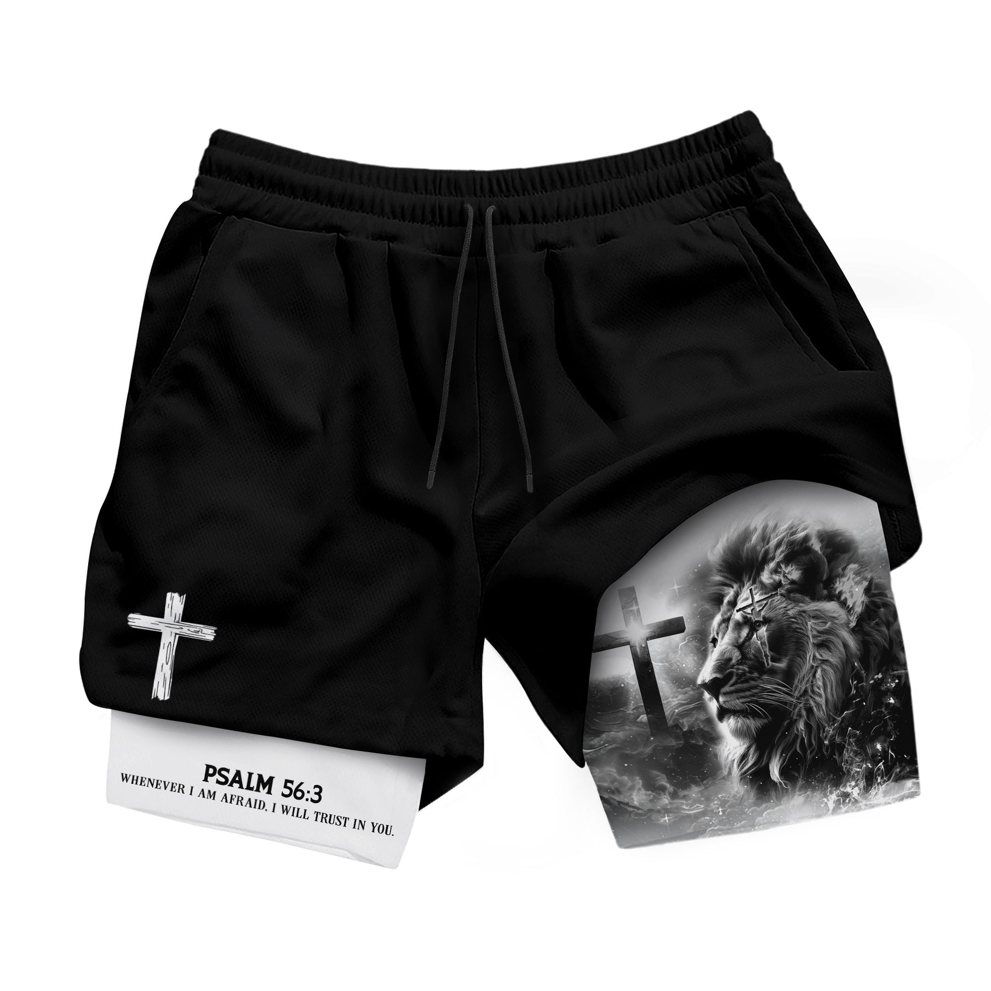 Christian gym shorts featuring Psalm 56 3 lion of Judah cross design A bold symbol of faith trust and courage in God