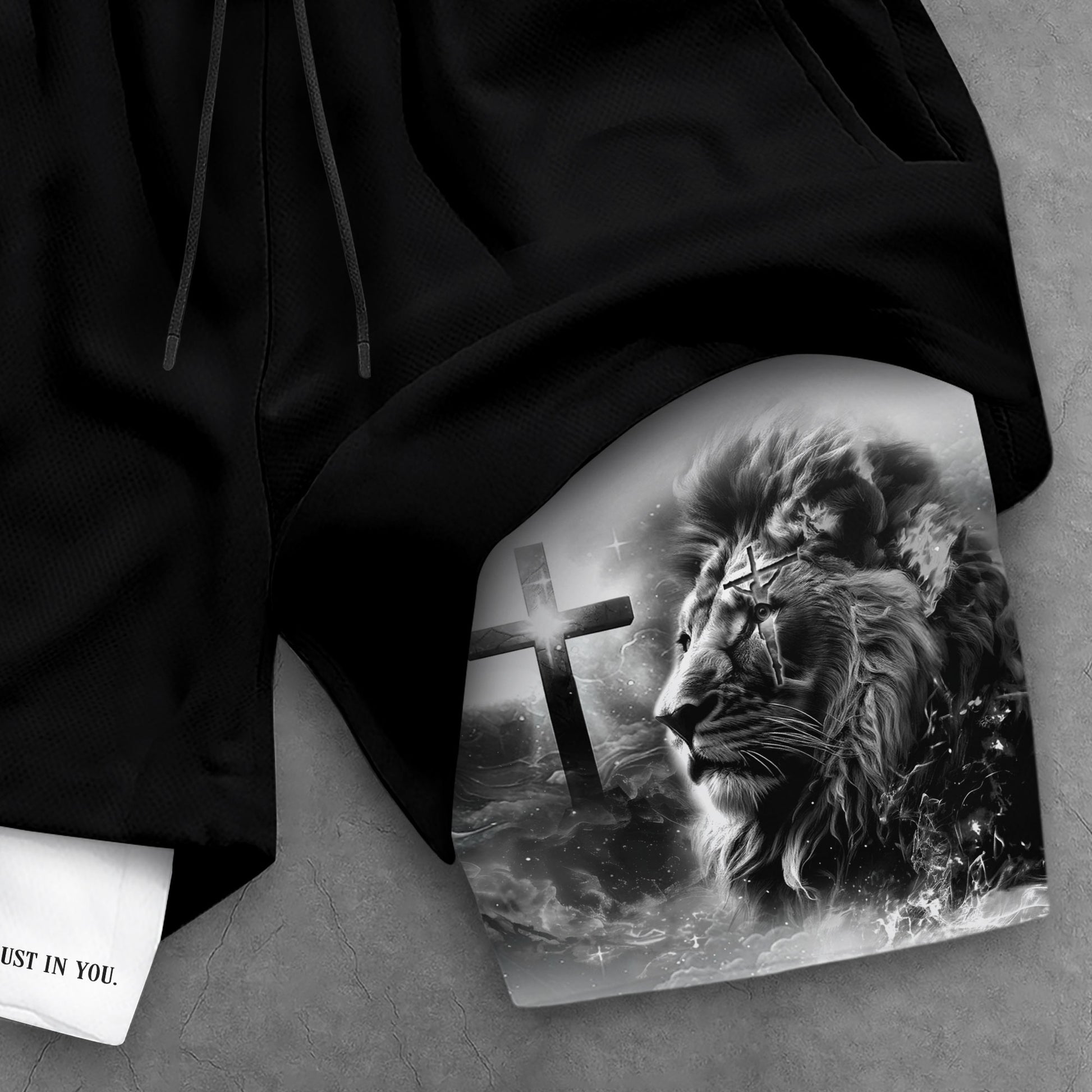 Psalm 56 3 Christian Gym Shorts for Men Lion of Judah Cross Design